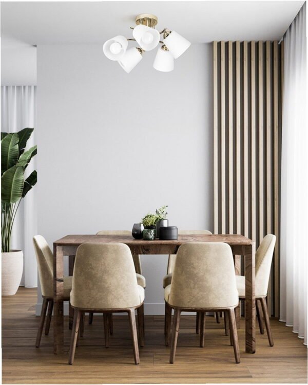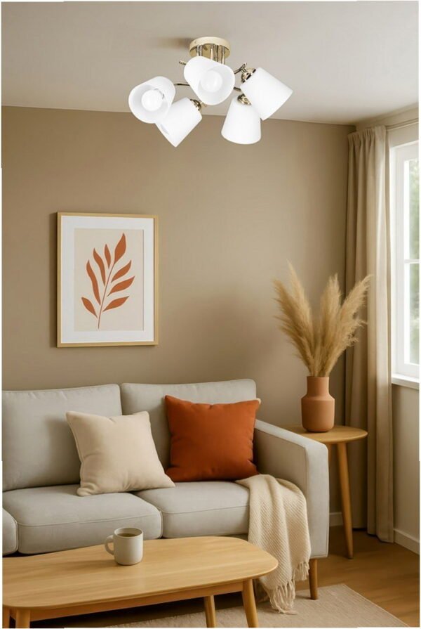 The Activejet AJE-EMILY 5P pendant light in gold offers an exquisite lighting solution that complements classical aesthetics, making it perfect for settings like living rooms, bedrooms, or hallways. With a design that includes frosted white glass and a sleek metal body, this lamp’s conical shape enhances the overall décor’s elegance. It supports five E27 bulbs with a maximum power of 40 W each, allowing a total output of 200 W, though it is intended for indoor use only, rated at IP20 for protection and compliant with ISO and CE standards.