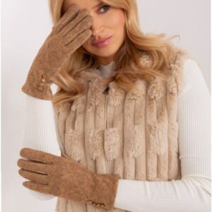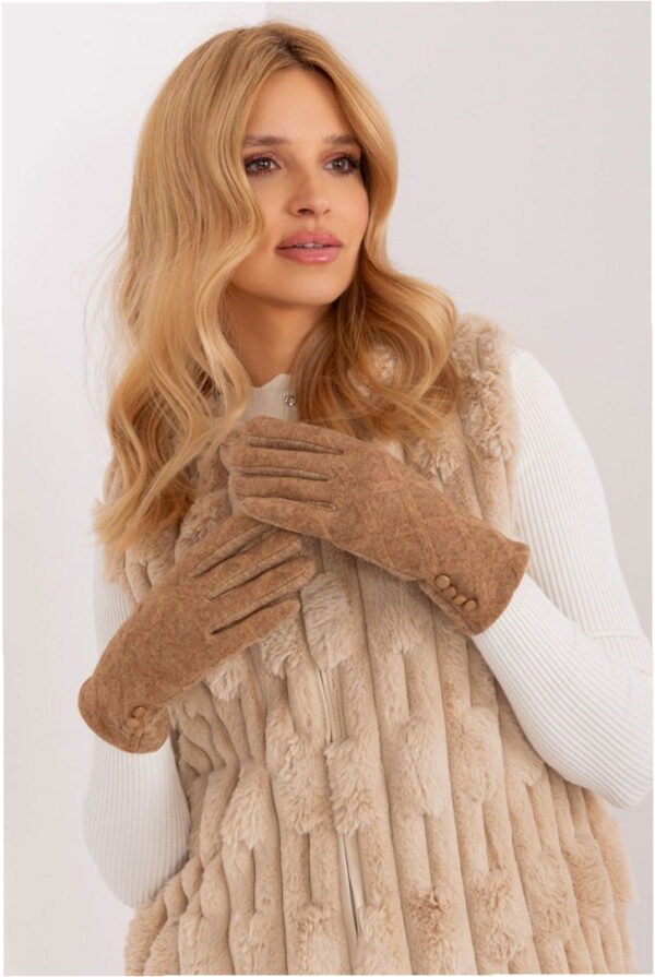 Elegant women’s gloves by AT feature a decorative geometric pattern, making them ideal for cooler days. With decorative buttons at the wrists, they add style to any outfit. The index finger displays an embroidered flower, allowing for phone usage without removing the gloves. Made from 60% cotton, 35% polyester, and 5% elastane, they offer both comfort and stretch. Available in sizes S/M and L/XL.