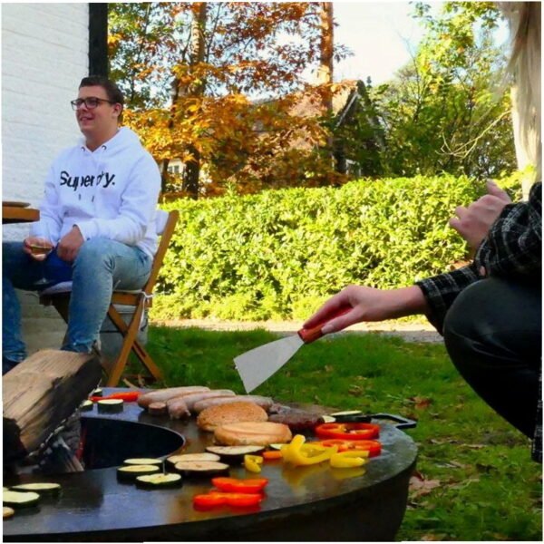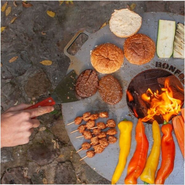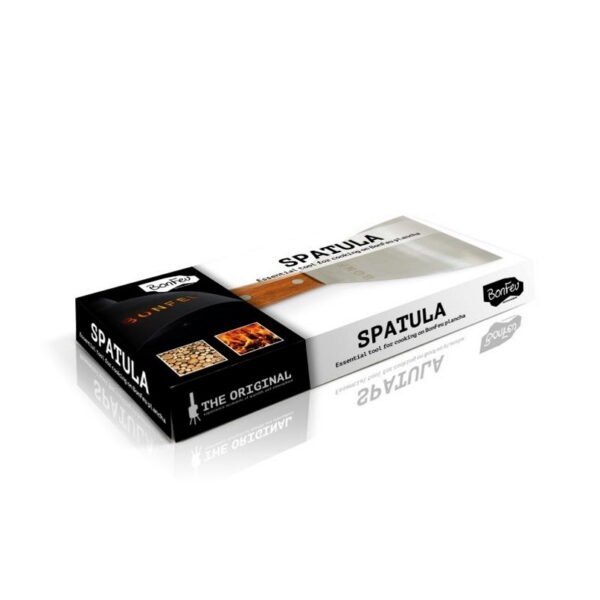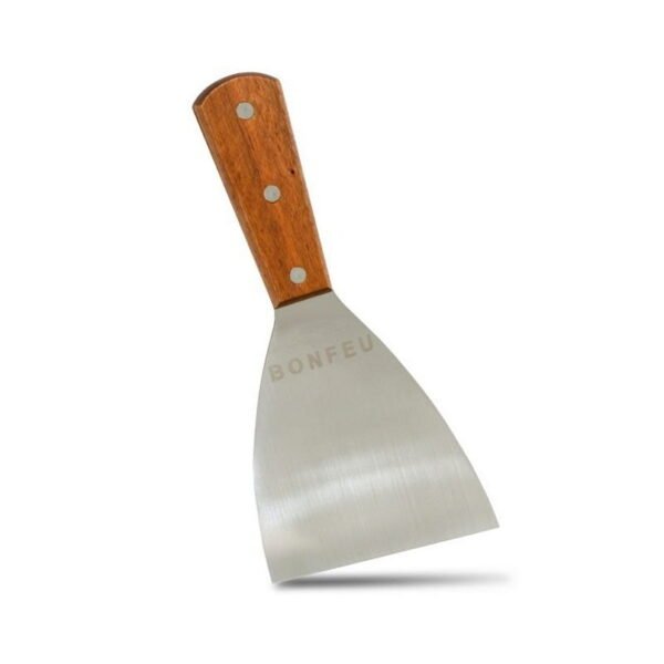 The BonFeu grill spatula provides a comfortable grip with its wooden handle and effective food flipping with its stainless steel blade.