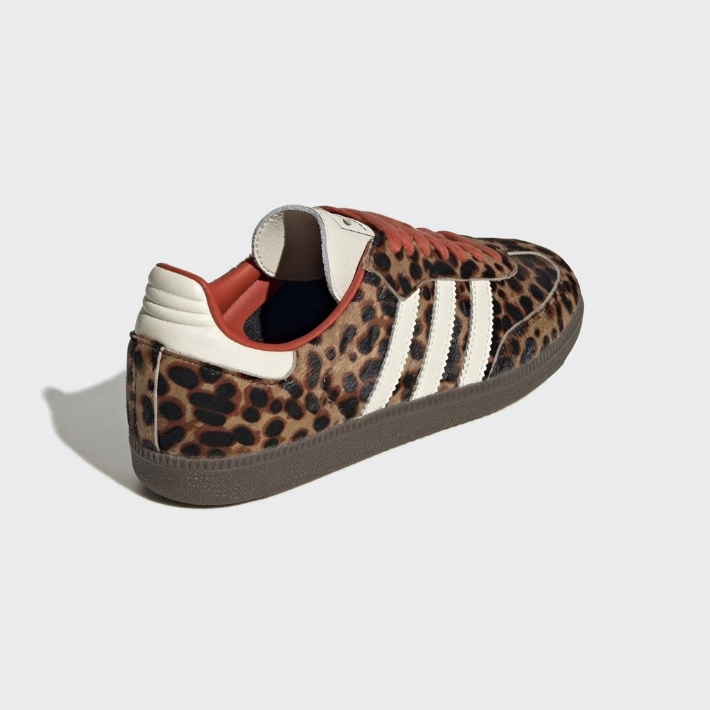 ADIDAS Samba OG Leopard Brown to reinterpretacja klasycznego modelu w wydaniu z motywem zwierzęcym. Cholewka łączy skórę naturalną w odcieniu brązu z cętkowaniem geparda, dopełnioną charakterystycznymi trzema paskami w kolorze ecru. Czerwone sznurówki i wkładka contrastują z główną kolorystyką, tworząc dynamiczną kompozycję.