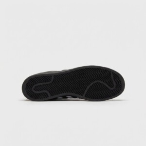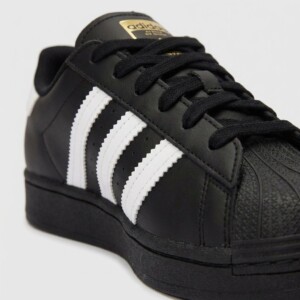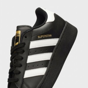Klasyczne sneakersy Adidas Superstar XLG w czarnej kolorystyce z białymi paskami i złotymi akcentami. Wykonane ze skóry naturalnej i materiałów tekstylnych. Charakterystyczna gumowa skorupa na palcach i gumowa podeszwa zapewniają trwałość.