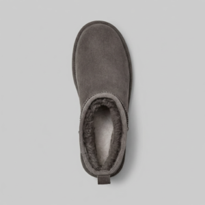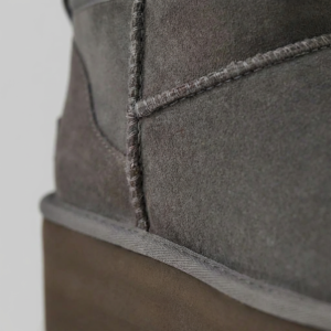 Ewolucja klasycznych UGG Classic Mini · Minimalistyczny design do kostki · Charakterystyczna sylwetka unowocześniona platformą · Elegancki odcień ciemnego brązu · Brak zapięcia – wsuwane