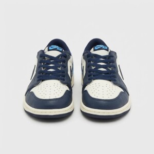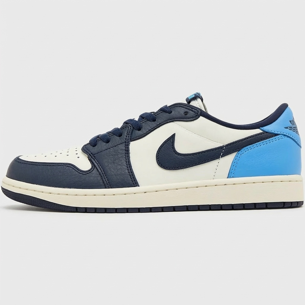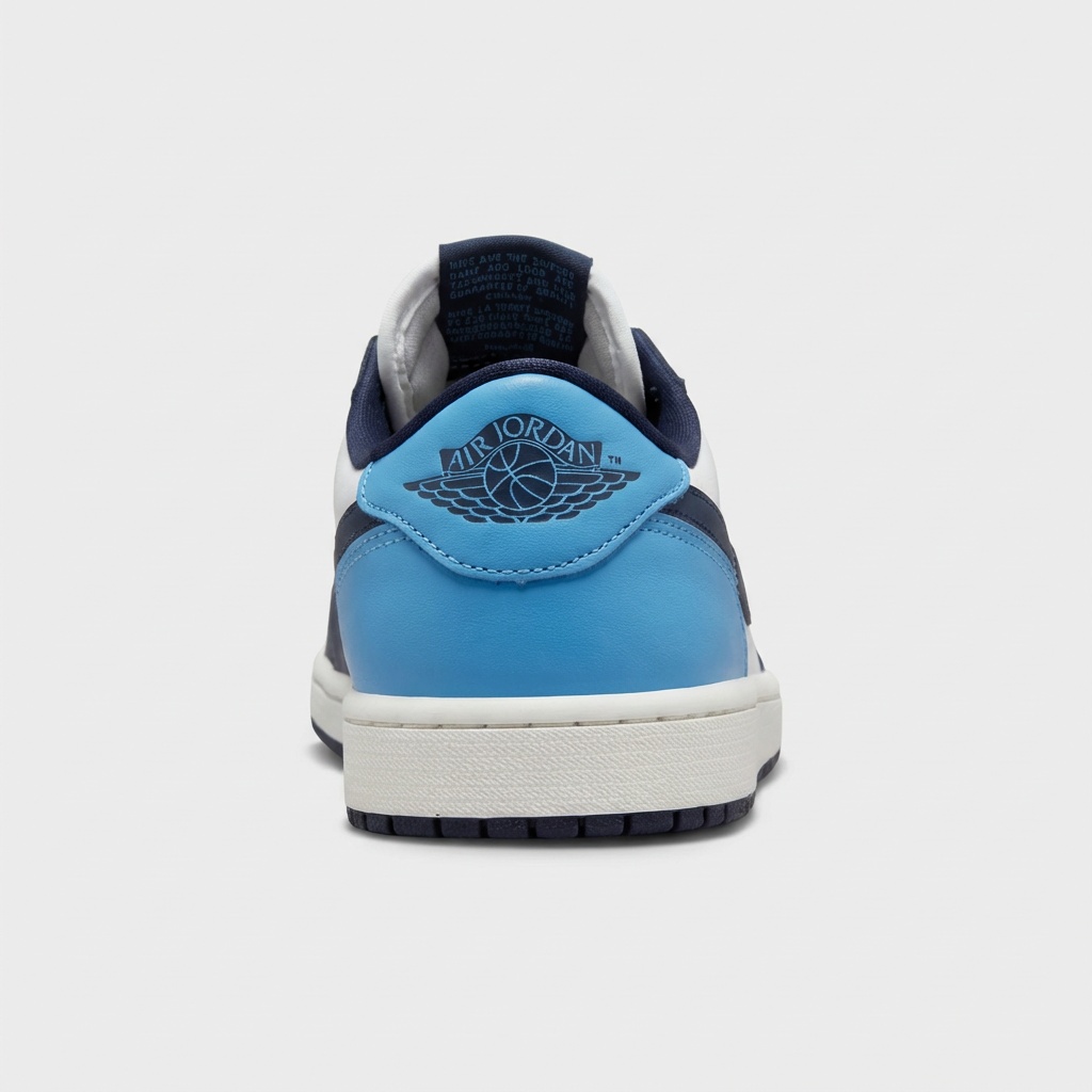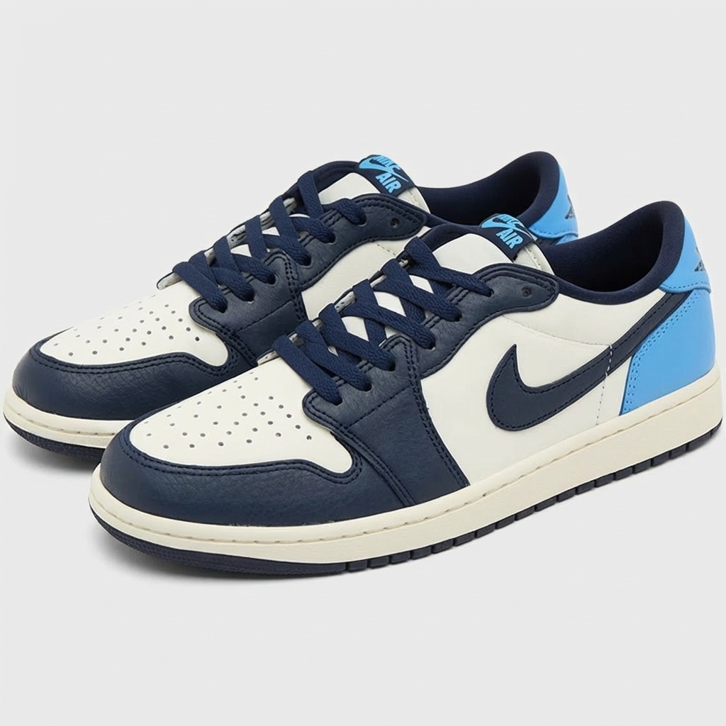 Buty NIKE Air Jordan 1 Low OG Obsidian UNC to interpretacja kultowego modelu z 1985 roku w uniwersyteckiej kolorystyce. Cholewka łączy granatową i białą skórę naturalną z błękitnymi akcentami na pięcie i logo Swoosh. Model wyróżnia się perforacjami na palcach oraz charakterystyczną podeszwą z technologią Air.