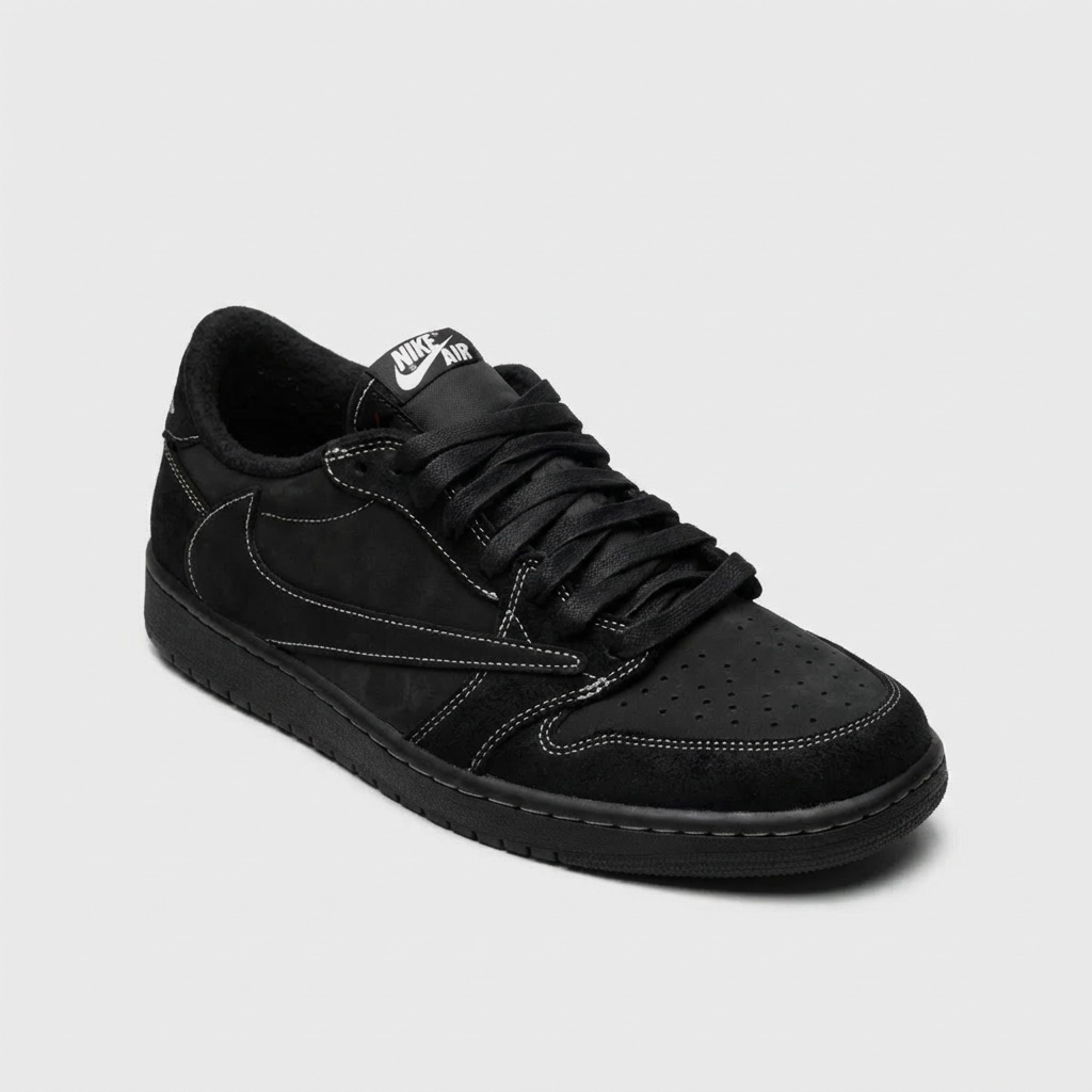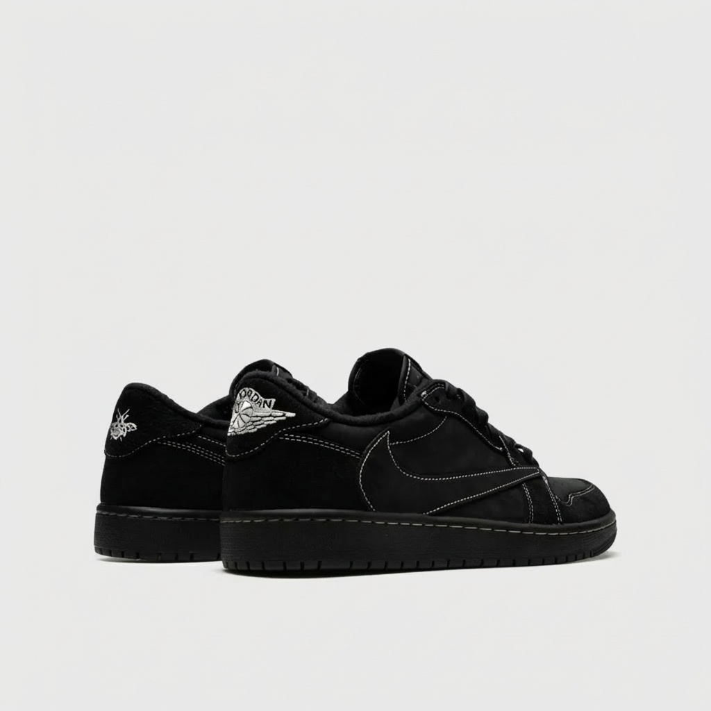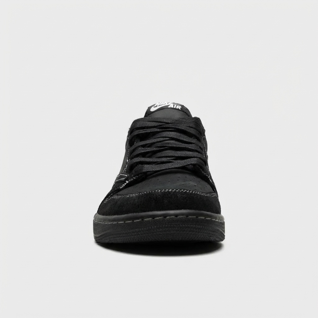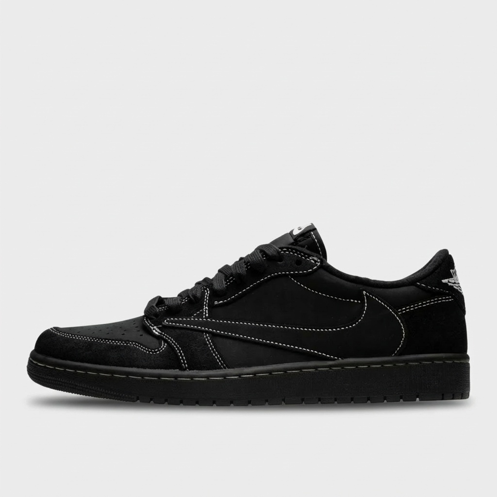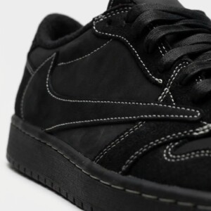 Buty NIKE Air Jordan 1 Low Travis Scott Black Phantom to połączenie ikonicznej sylwetki z artystyczną wizją rapera. Model charakteryzuje się całkowicie czarną kolorystyką z kontrastowymi białymi przeszyciami. Wykonane ze skóry naturalnej z wstawkami z materiałów tekstylnych zapewniają trwałość i komfort noszenia.