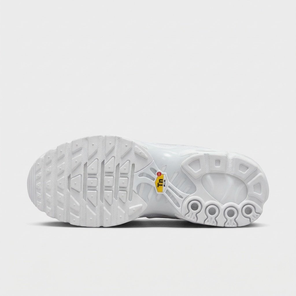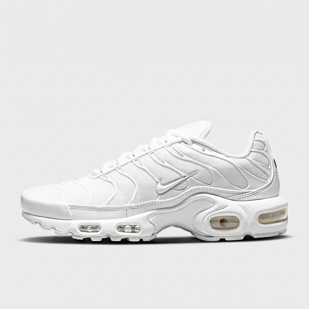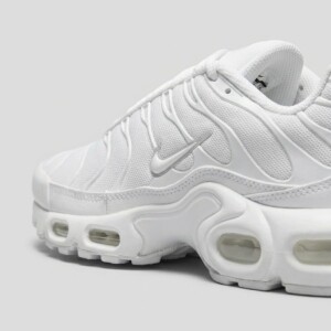 Nike Air Max Plus TN w wersji Triple White to model charakteryzujący się przepływającymi liniami na cholewce inspirowanymi anatomią stopy. Podeszwa wyposażona w system amortyzacji Air Max z widocznymi komorami powietrznymi zapewnia komfort podczas noszenia. Monochromatyczna biała kolorystyka obejmuje całą konstrukcję buta.
