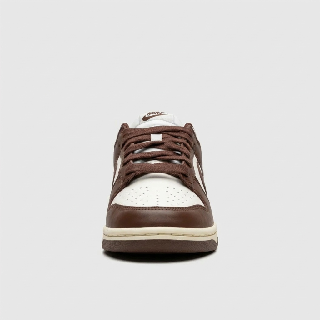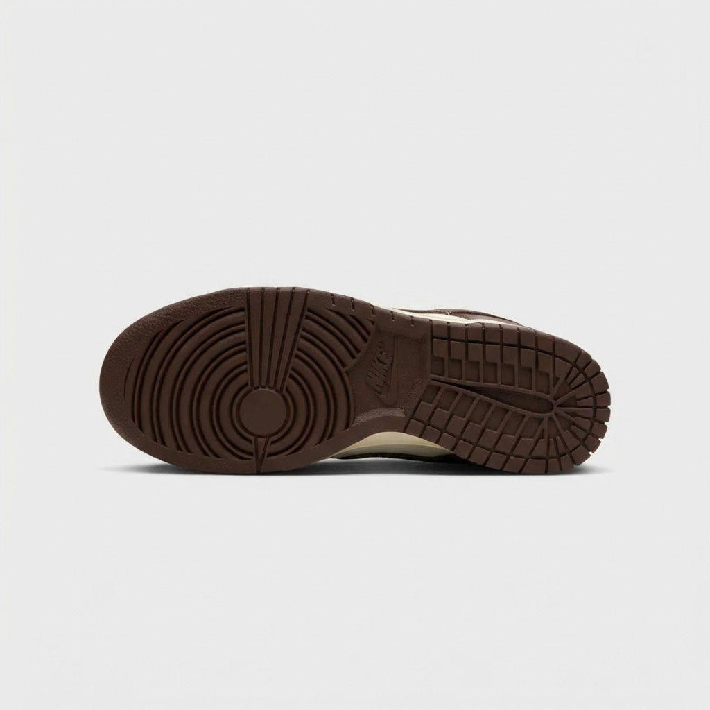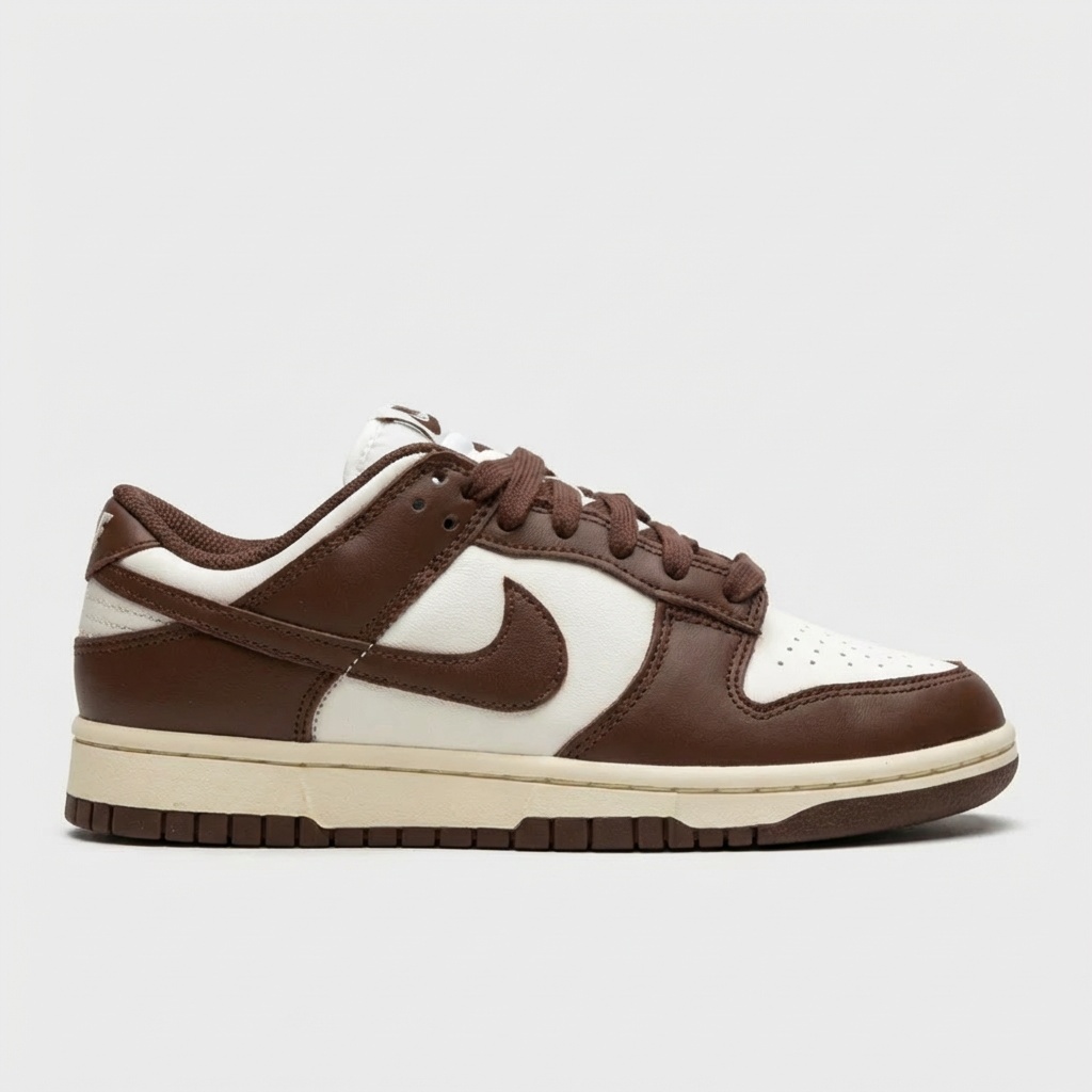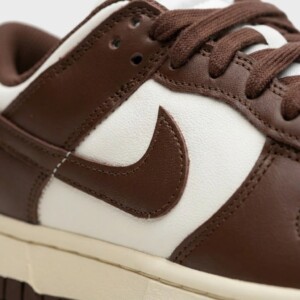 Nike Dunk Low Cacao Wow to klasyczne sneakersy w earth tone kolorystyce. Górna część wykonana z brązowej skóry naturalnej kontrastuje z beżowymi panelami i perforacjami na palcach. Model wyposażony w tradycyjną podeszwę z wzorem koszyczki i charakterystyczne logo Nike Swoosh.