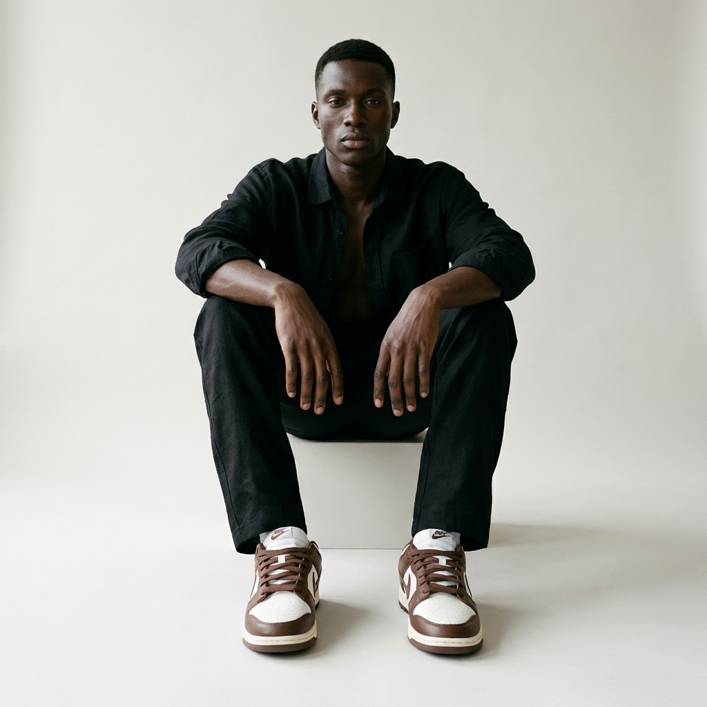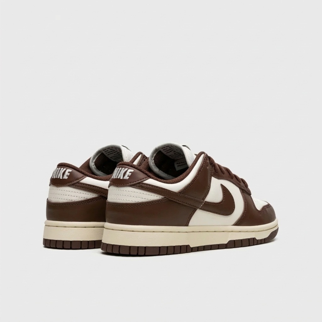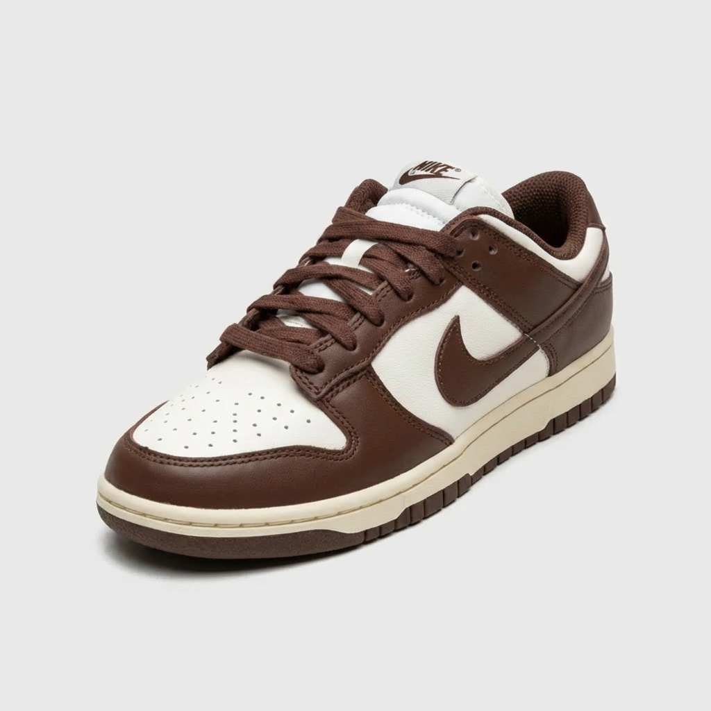 Nike Dunk Low Cacao Wow to klasyczne sneakersy w earth tone kolorystyce. Górna część wykonana z brązowej skóry naturalnej kontrastuje z beżowymi panelami i perforacjami na palcach. Model wyposażony w tradycyjną podeszwę z wzorem koszyczki i charakterystyczne logo Nike Swoosh.