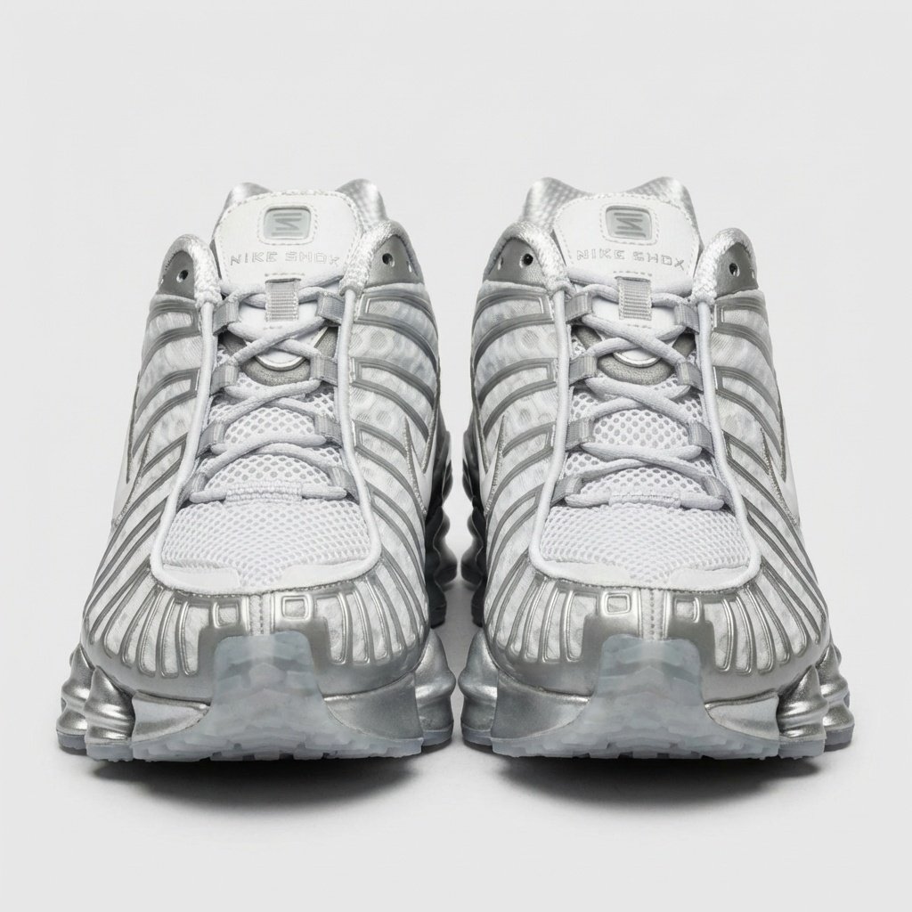 Nike Shox TL Chrome Pure Platinum to buty sportowe o futurystycznym designie i zaawansowanej technologii amortyzacji. Charakterystyczne kolumny Shox w podeszwie środkowej zapewniają skuteczne tłumienie wstrząsów podczas każdego kroku. Metaliczna kolorystyka nadaje modelowi nowoczesny charakter.