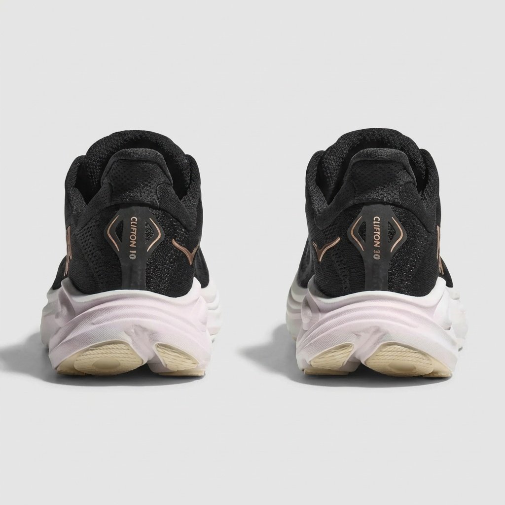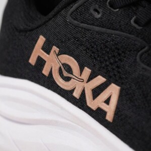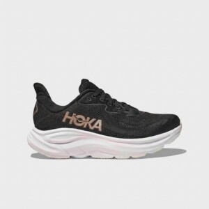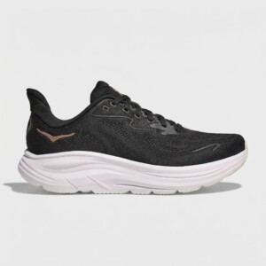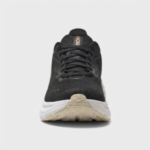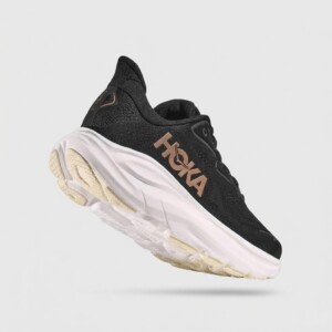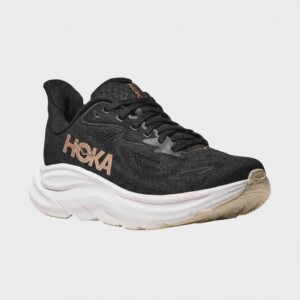 Model Clifton 10 to dziesiąta generacja popularnej linii butów do biegania marki HOKA. Charakteryzują się lekką konstrukcją z tekstylną cholewką w kolorze czarnym oraz wysoką podeszwą środkową w kolorze białym. Miedziane logo HOKA na boku stanowi kontrastowy akcent kolorystyczny.