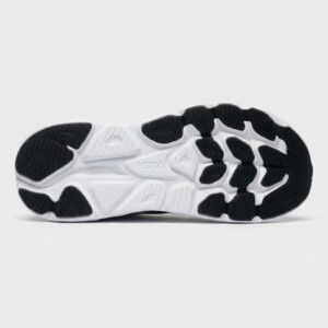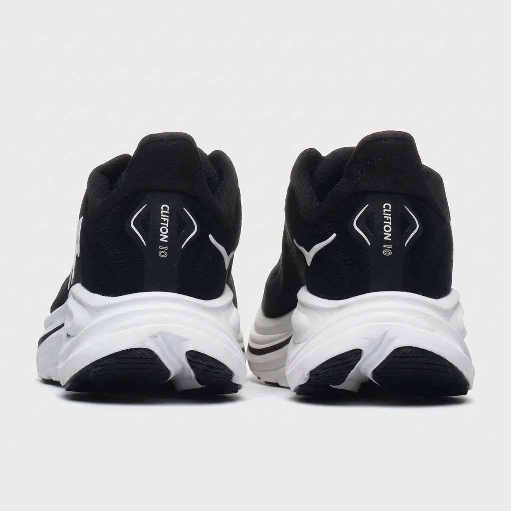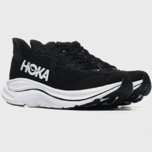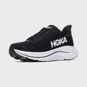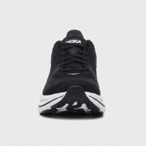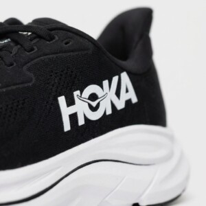 Buty do biegania HOKA Clifton 10 wyróżniają się grubą podeszwą środkową oferującą efektywną amortyzację podczas treningu. Cholewka łączy materiał tekstylny z syntetycznymi elementami, zapewniając trwałość i wsparcie stopy. Kontrastowe białe logo HOKA wyróżnia się na czarnym tle cholewki.