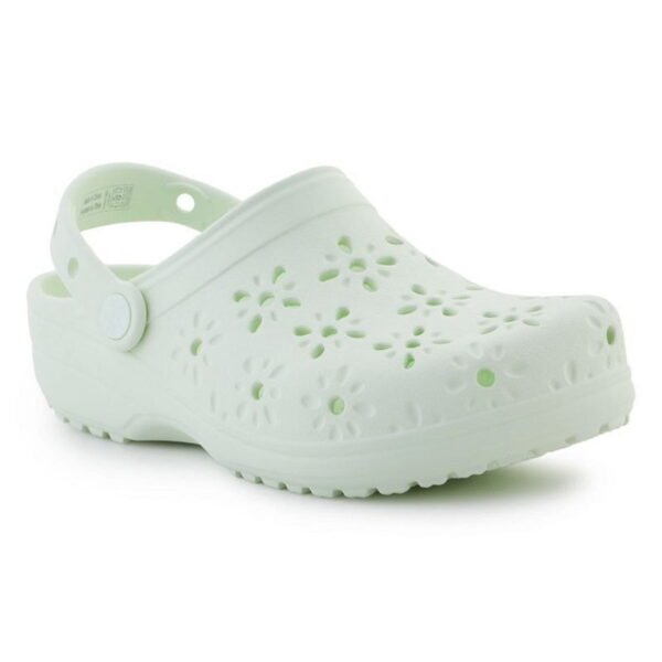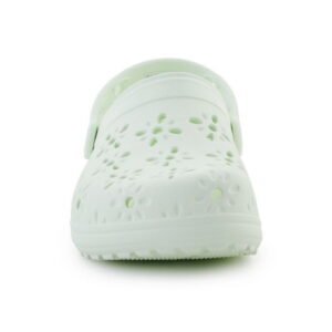 The Crocs Classic Floral Cut Out Clog 210927-3YH in Jade Tint combines comfort and summer charm. Made from lightweight, waterproof Croslite™ material, these clogs conform to the foot and are easy to clean. The decorative floral cut-out upper adds subtle style and breathability, while the adjustable heel strap ensures stability. Ideal for everyday wear and holiday strolls.
