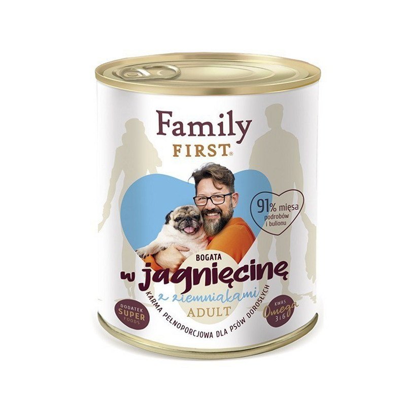 Wet dog food from Family FIRST with lamb and potatoes, perfect for adult dogs of any breed.