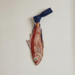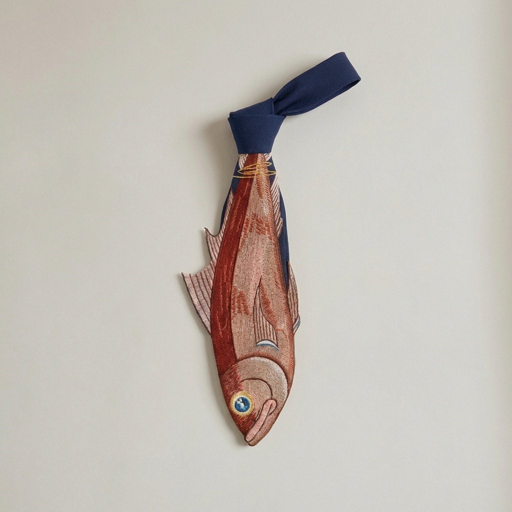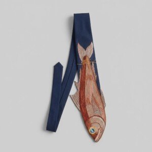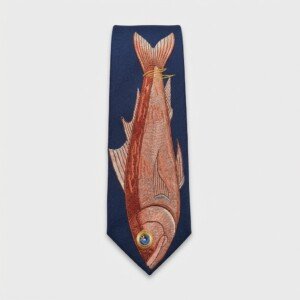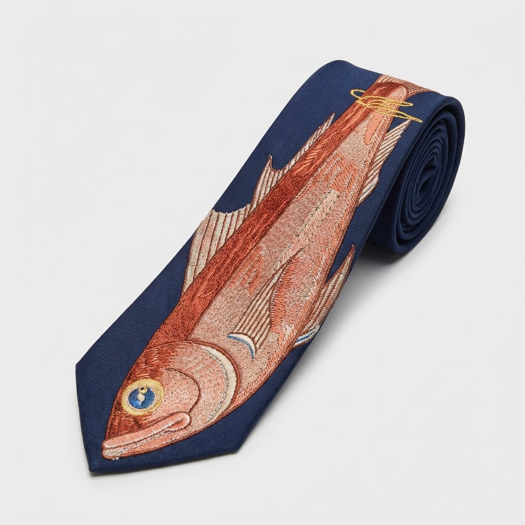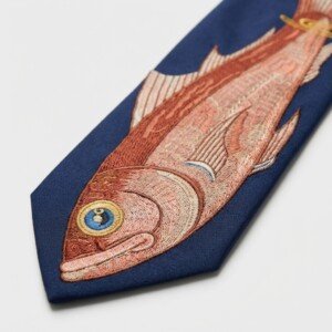 Designerski krawat łączący klasyczną elegancję z odważnym motywem haftowanej ryby. Wykonany z gładkiej satynowej tkaniny w kolorze granatowym z precyzyjnym haftem maszynowym przedstawiającym rybę w naturalnych odcieniach łososia, terakoty i beżu. Odporne barwniki zapewniają trwałość kolorów przy codziennym noszeniu.