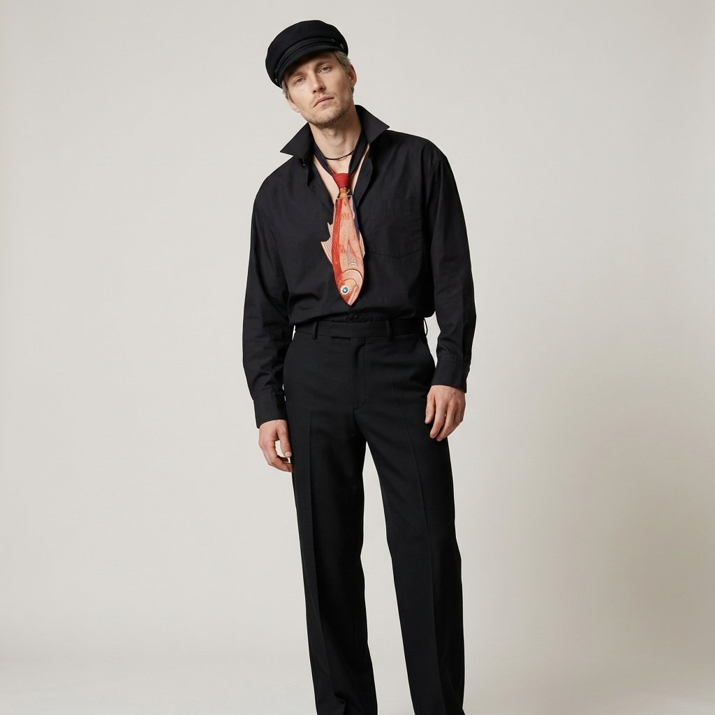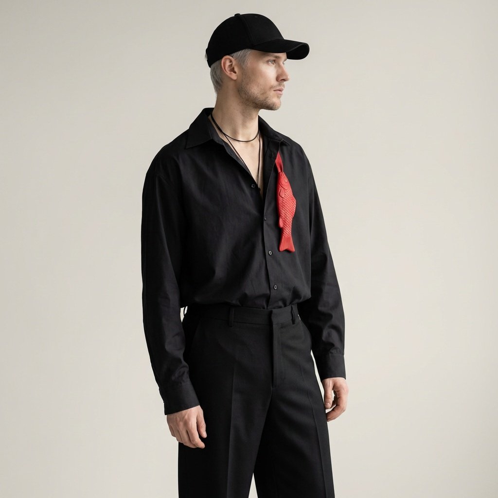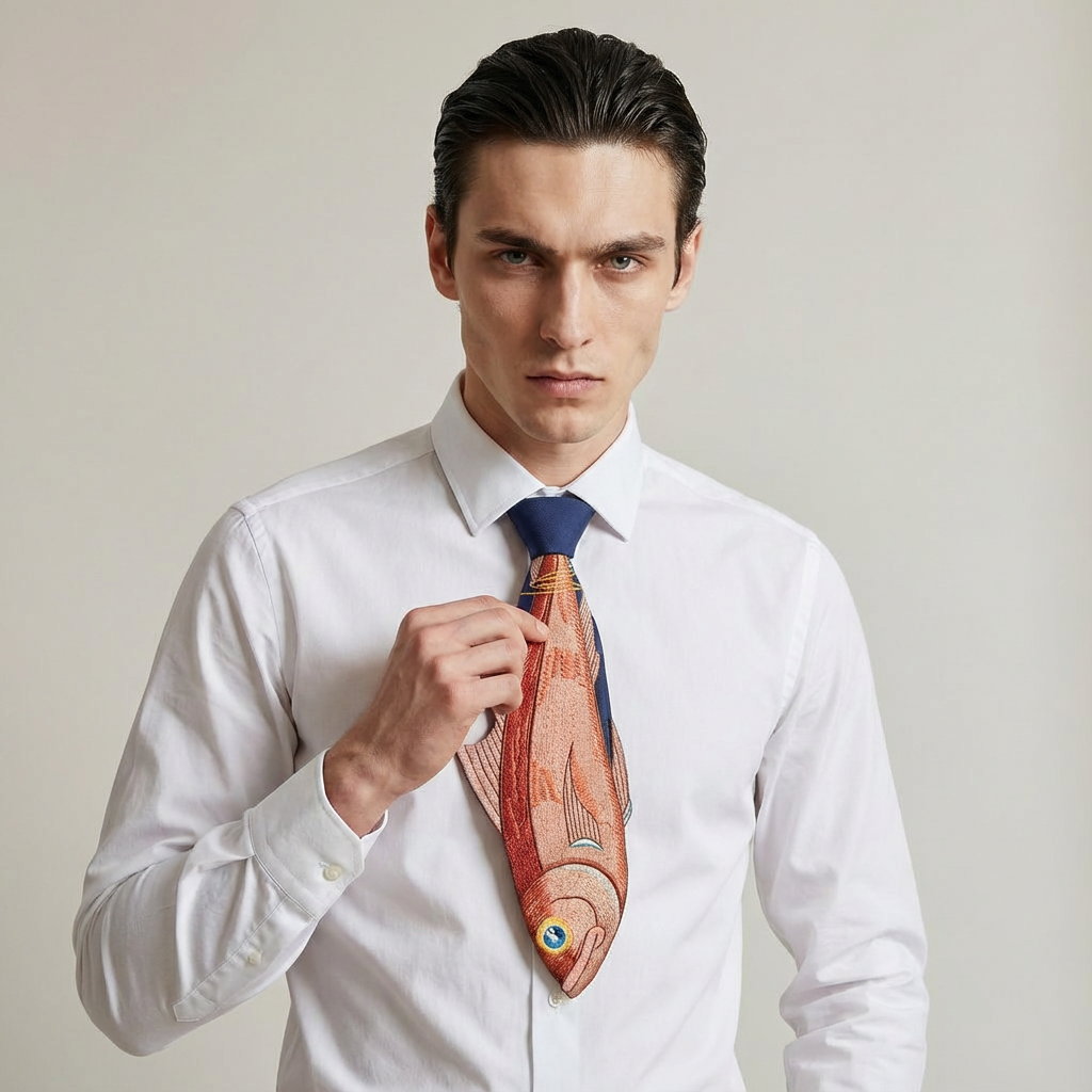 Idealny do klasycznych garniturów w kolorze granatowym lub szarym, gdzie rybi motyw stanie się eleganckim akcentem. Doskonale sprawdza się w biurowych stylizacjach dla osób ceniących subtelną oryginalność. Można zestawić z białą lub błękitną koszulą, zachowując balans między formalnością a charakterem.