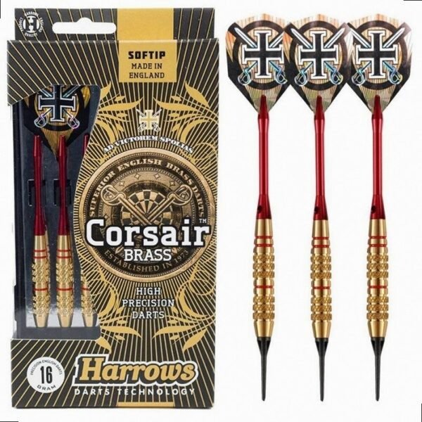 Harrows Corsair Softip HS-TNK Darts Properties: Corsair model-is the perfect choice for beginner players. They have narrow, brass barreles combined with shaft of anodized aluminum and aerodynamic feathers. They are available in three different colors. Darts have a plastic cave (soft tip), and are intended for playing on electronic discs. The packaging may differ from the one shown in the photo.