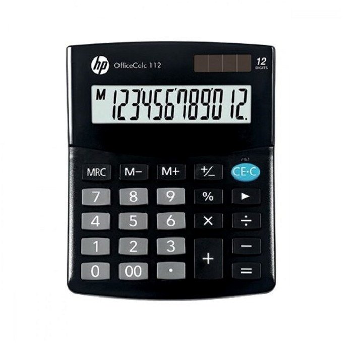 The Hewlett-Packard OC 112/INT BX office calculator in classic black blends functionality with an efficient design, perfect for everyday use. It features a clear LCD display that can show up to 12 digits simultaneously, making calculations easy to read and understand. Its pocket-size layout is made from durable plastic, allowing for portability and ease of use. With 24 buttons and a single memory storage, the calculator is designed for practicality. Additionally, it is powered by both an LR1130 battery and solar energy, providing extended operational life and energy efficiency through its automatic shut-off feature.