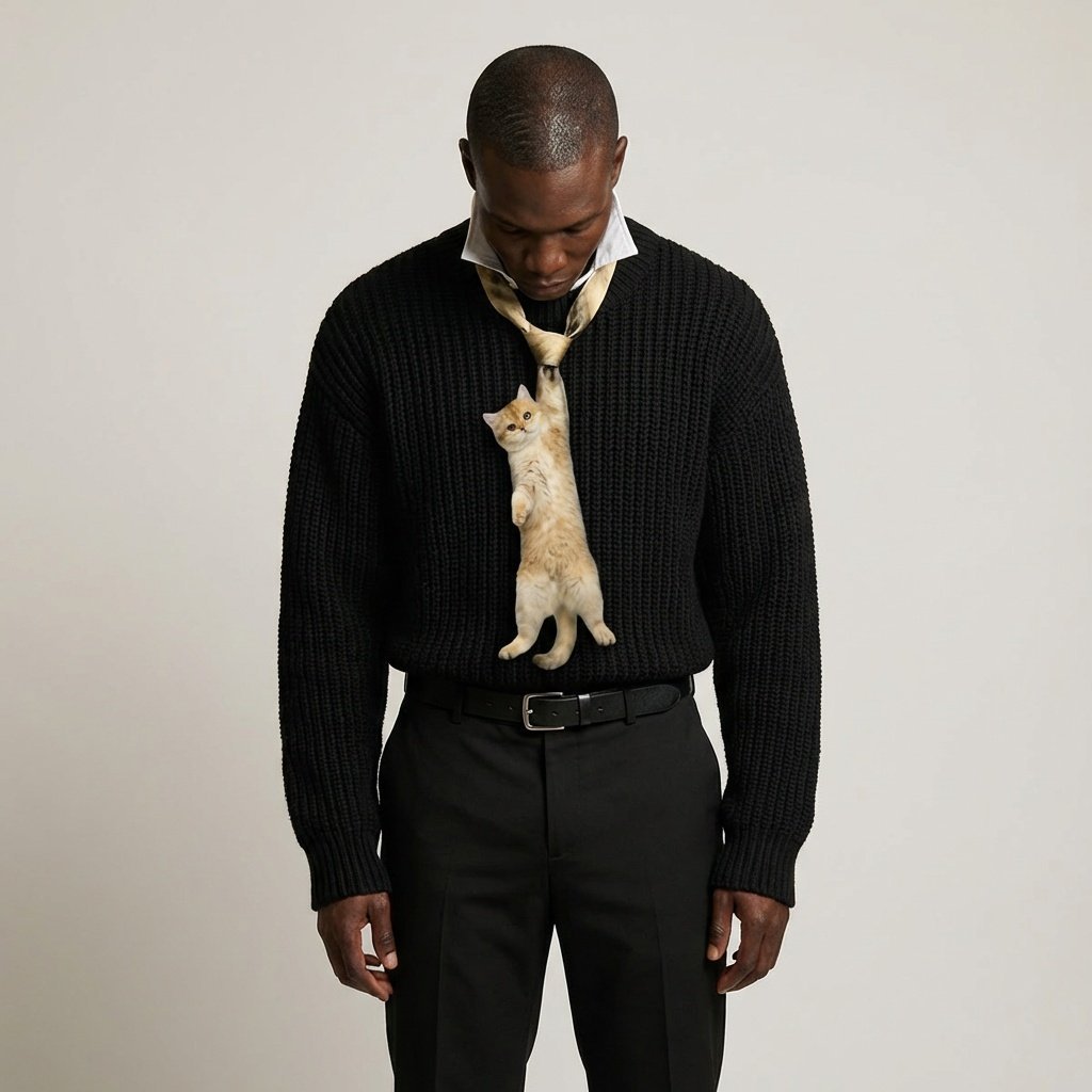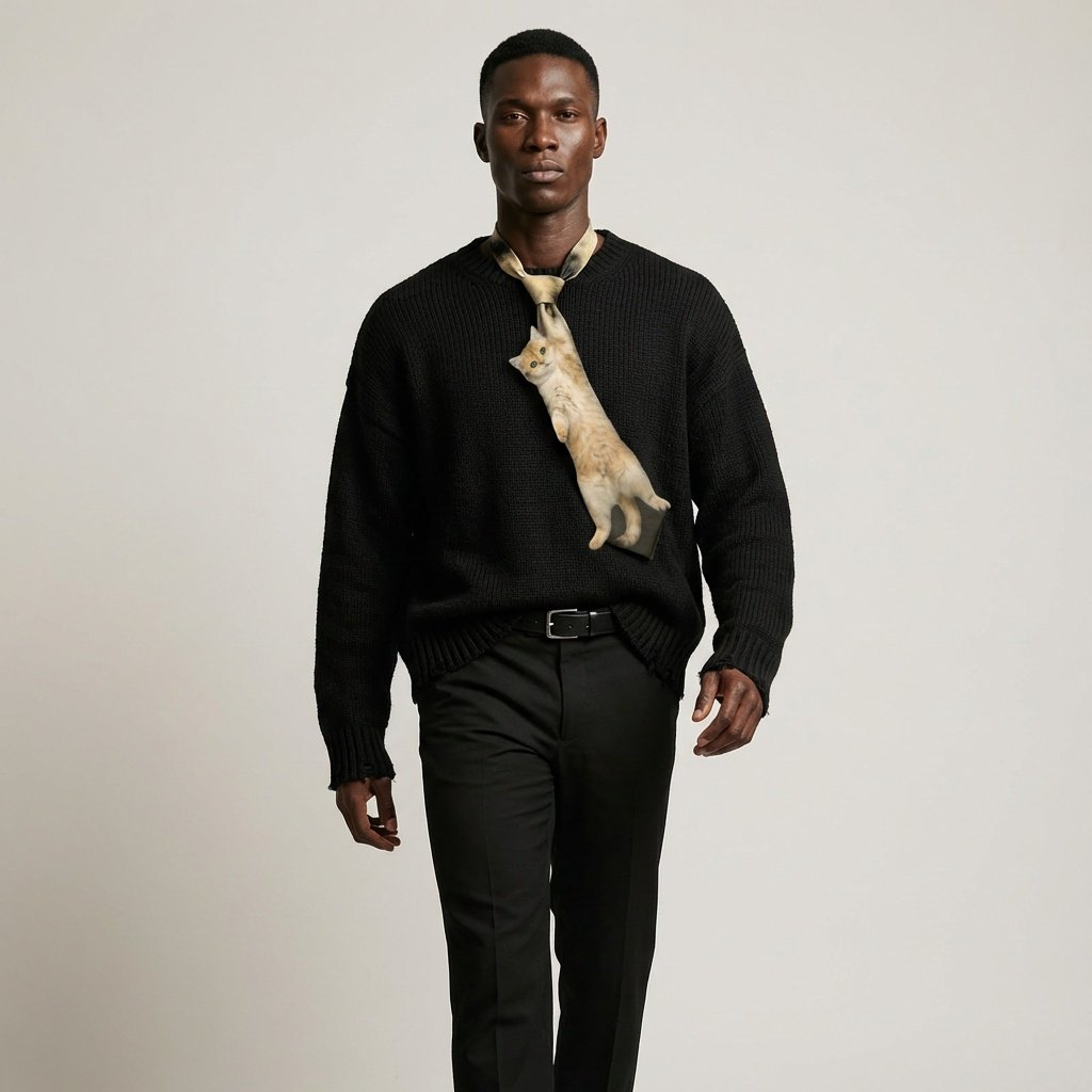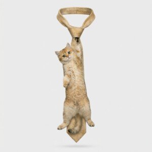 Krawat z realistycznym printem kota brytyjskiego w umaszczeniu golden łączy elegancję z subtelnym akcentem dla miłośników zwierząt. Beżowo-złoty kot przedstawiony w naturalnej pozie wisi na powierzchni krawata, tworząc spójną kolorystyczną całość. Wykonany z gładkiej satynowej tkaniny zapewniającej komfort noszenia przez cały dzień.