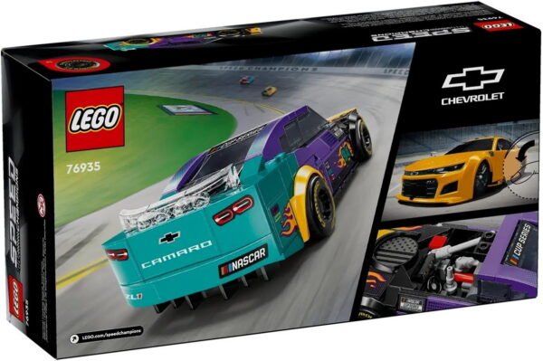 The LEGO Speed Champions 76935 showcases the stunning NASCAR Next Gen Chevrolet Camaro ZL1 model, a must-have for car enthusiasts and collectors. With 328 meticulously crafted pieces and one authentic minifigure, this set guarantees an engaging building experience. It measures 70 mm in width, 40 mm in height, and 160 mm in depth, making it a perfect display piece. Suitable for those aged 9 and above, the set comes complete with clear and easy-to-follow assembly instructions. The packaging dimensions are 261 mm x 142 mm x 71 mm, with a total weight of 362 g.