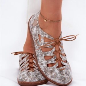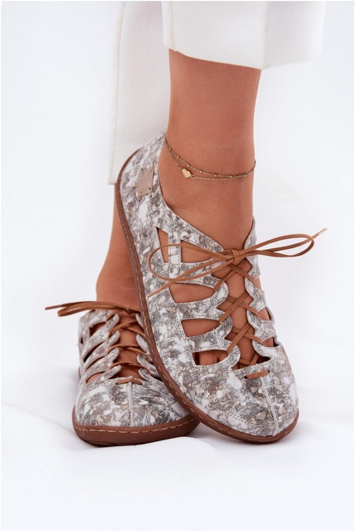 Model 06835-25/00-1 to klasyczne baleriny damskie o eleganckiej konstrukcji z naturalnej skóry w kolorze złotym. Cholewka wykonana jest z miękkiej skóry licowej o wzorzystym wykończeniu i delikatnych wycięciach, które zwiększają przewiewność. W przedniej części zastosowano ozdobne wiązanie pełniące funkcję estetyczną oraz wspomagającą dopasowanie obuwia. Wnętrze wraz z wkładką wykonane zostało ze skóry naturalnej, co ogranicza ryzyko podrażnień oraz ułatwia utrzymanie komfortu termicznego. Podeszwa o wysokości obcasa 1 cm wykonana jest z elastycznego materiału syntetycznego o właściwościach amortyzujących i stabilizujących. Całość konstrukcji osadzona jest na niskim kroju z wysokością cholewki około 6 cm, co ułatwia zakładanie i zapewnia swobodę ruchu stopy. Model przeznaczony jest do codziennego użytkowania i lekkich stylizacji miejskich.