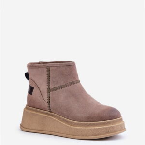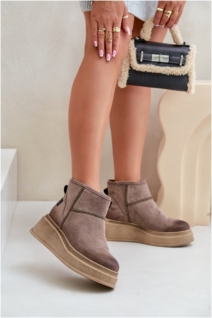 Śniegowce z naturalnej skóry zamszowej z ociepleniem z kożucha. Platforma i koturn zapewniają stabilność, a sztywne zapiętki wzmacniają konstrukcję. Przeznaczone na warunki zimowe.