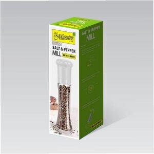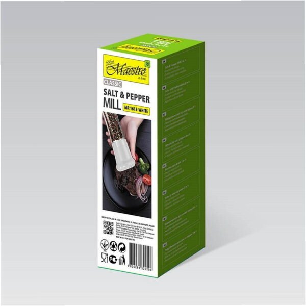 The MAESTRO MR-1613 salt and pepper grinder in white combines functionality with a simple design. Its detachable lid allows for easy refilling of spices. Suitable for home use, this grinder is perfect for seasoning dishes with both salt and pepper. Measuring 210mm in width, 80mm in length, and 80mm in height, it makes a practical addition to any dining table.