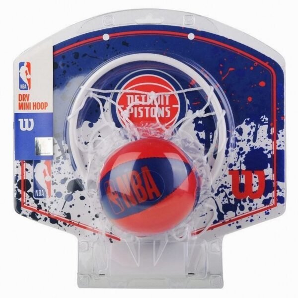 Basketball board Mini Wilson NBA Team Detroit Pistons WTBA1302DET Properties: Mini Basketball Board Wilson will allow you to play active. The set can be attached, for example, to a wall or door. On the front there is a print with the logo of one of the NBA league teams – Detroit Pistons The set is an official product with the NBA league license. A rim, mesh and soft ball included. Dimensions: 30cm x 25cm
