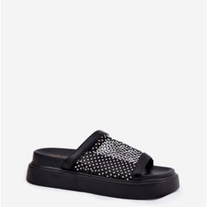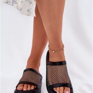 Model MY51-016 to damskie klapki o konstrukcji platformowej wykonane ze skóry ekologicznej w kolorze czarnym. Cholewka z pojedynczym paskiem w formie siateczki została ukształtowana tak, aby utrzymać równowagę pomiędzy stabilnością a przewiewnością. Materiał syntetyczny o jednolitej strukturze wykazuje odporność na rozciąganie i łatwość w czyszczeniu. Wkładka również wykonana z ekoskóry zapewnia jednolitą powierzchnię kontaktową z stopą. Platforma o wysokości 4 cm została uformowana z materiału o zwiększonej gęstości dla kontroli ugięcia i stabilności. Podeszwa z tworzywa syntetycznego posiada delikatny bieżnik zwiększający przyczepność na suchych nawierzchniach. Konstrukcja wsuwana ułatwia zakładanie bez użycia dodatkowego zapięcia. Model przeznaczony jest do użytkowania w warunkach miejskich podczas sezonu letniego.