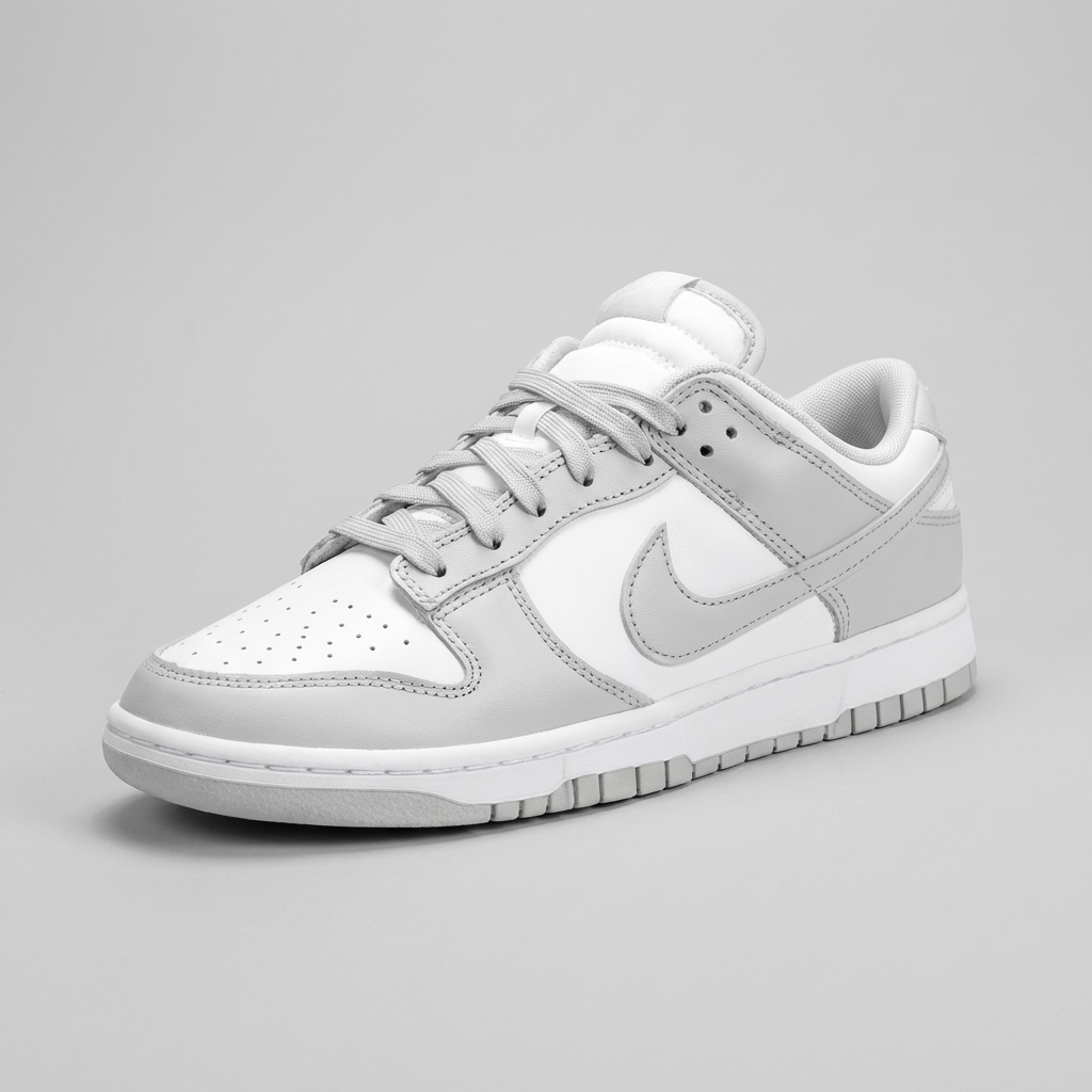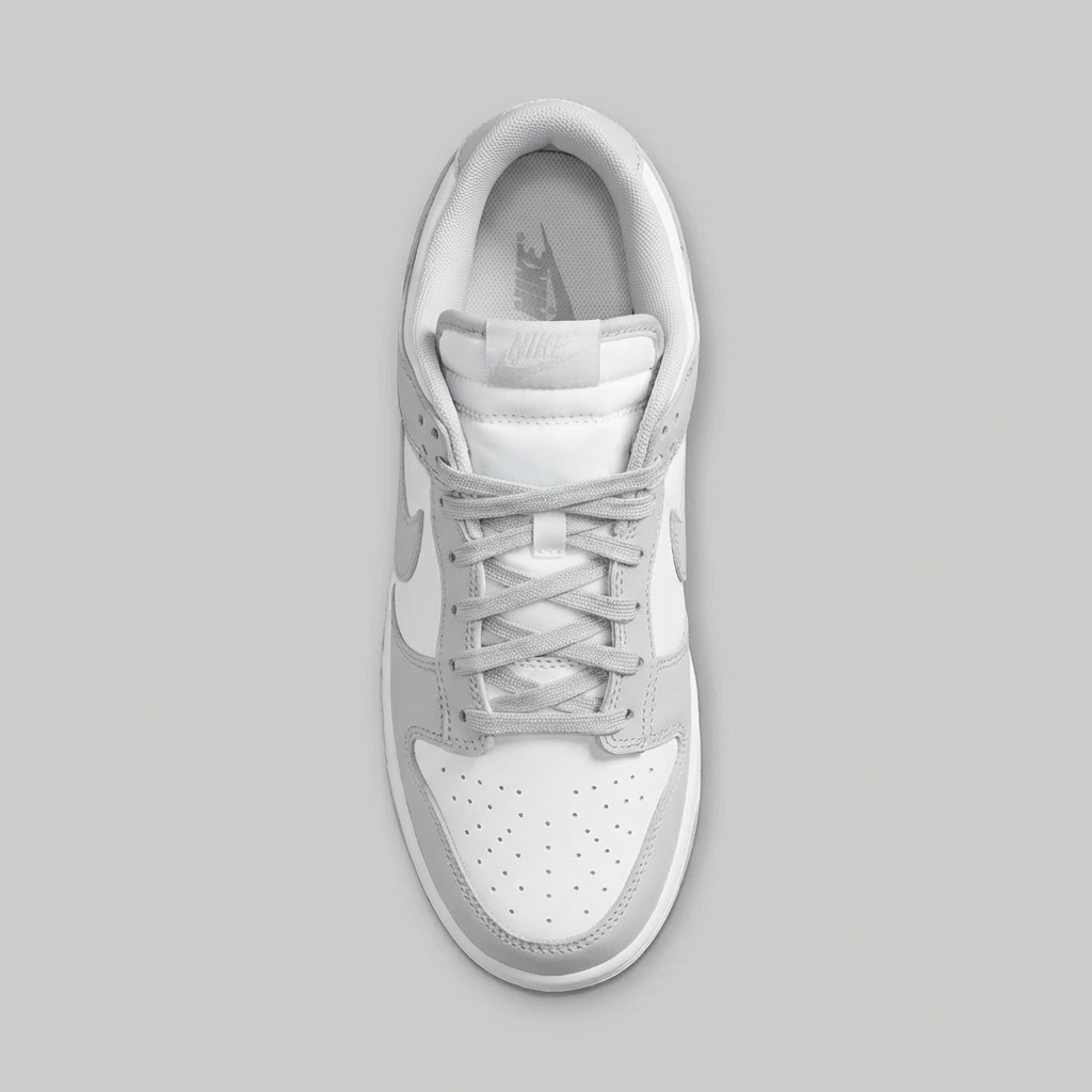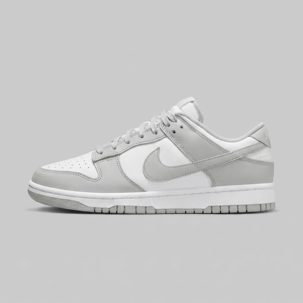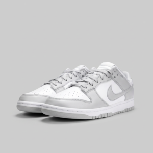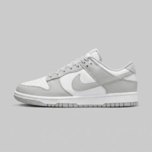 Kultowa sylwetka Dunk Low pierwotnie zaprojektowana dla koszykarzy · Charakterystyczna linia Swoosh i perforacje na toe boxie · Kontrastujące panele w kolorystyce White/Grey Fog · Niska cholewka zapewnia swobodę ruchów w kostce · Klasyczny design retro basketball