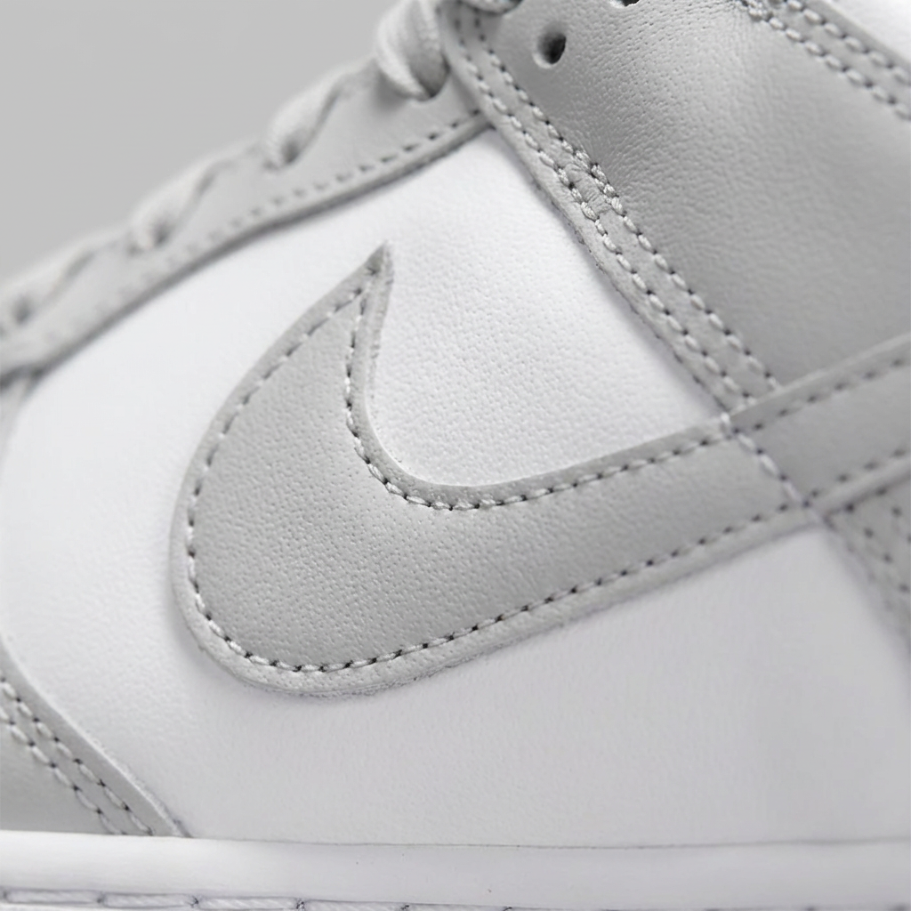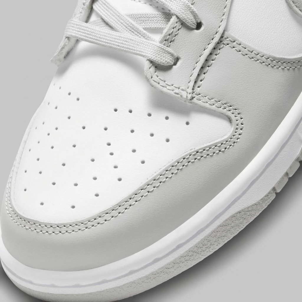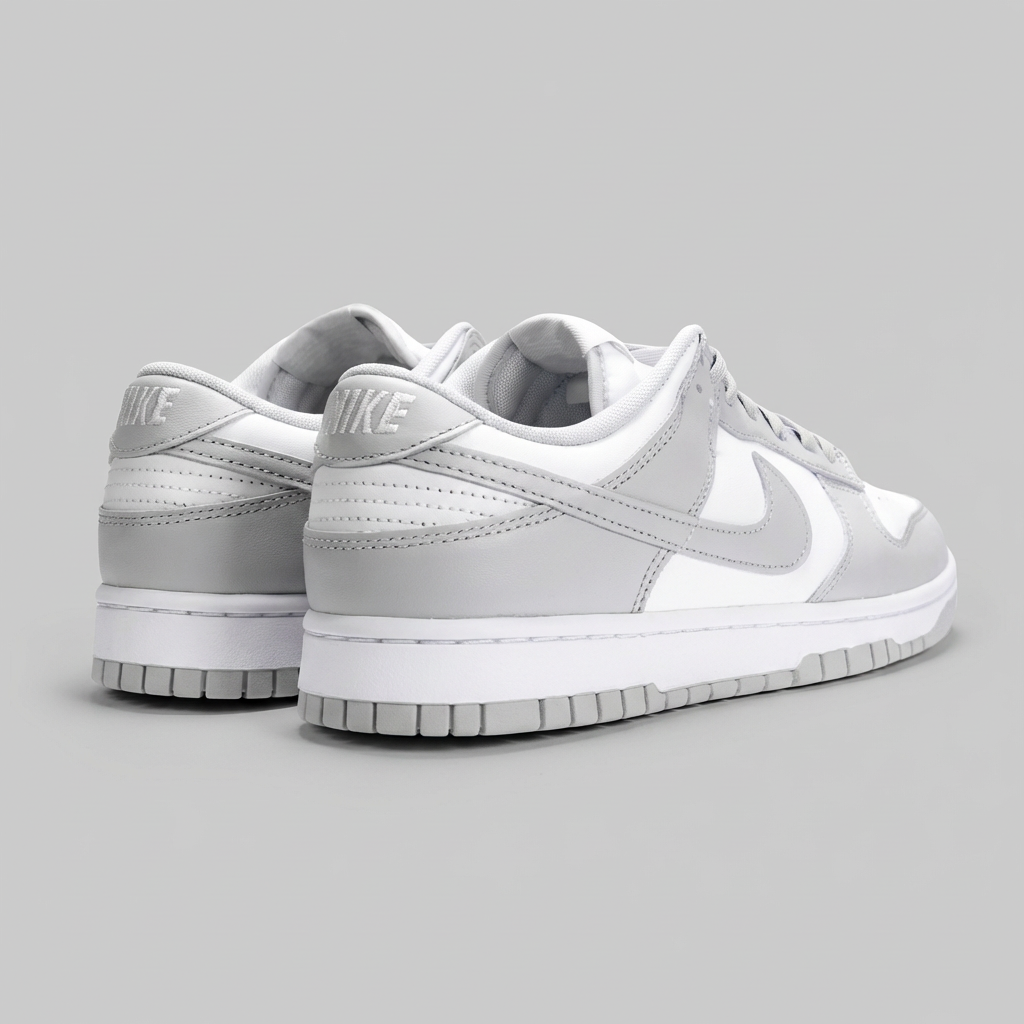 Kultowa sylwetka Dunk Low pierwotnie zaprojektowana dla koszykarzy · Charakterystyczna linia Swoosh i perforacje na toe boxie · Kontrastujące panele w kolorystyce White/Grey Fog · Niska cholewka zapewnia swobodę ruchów w kostce · Klasyczny design retro basketball