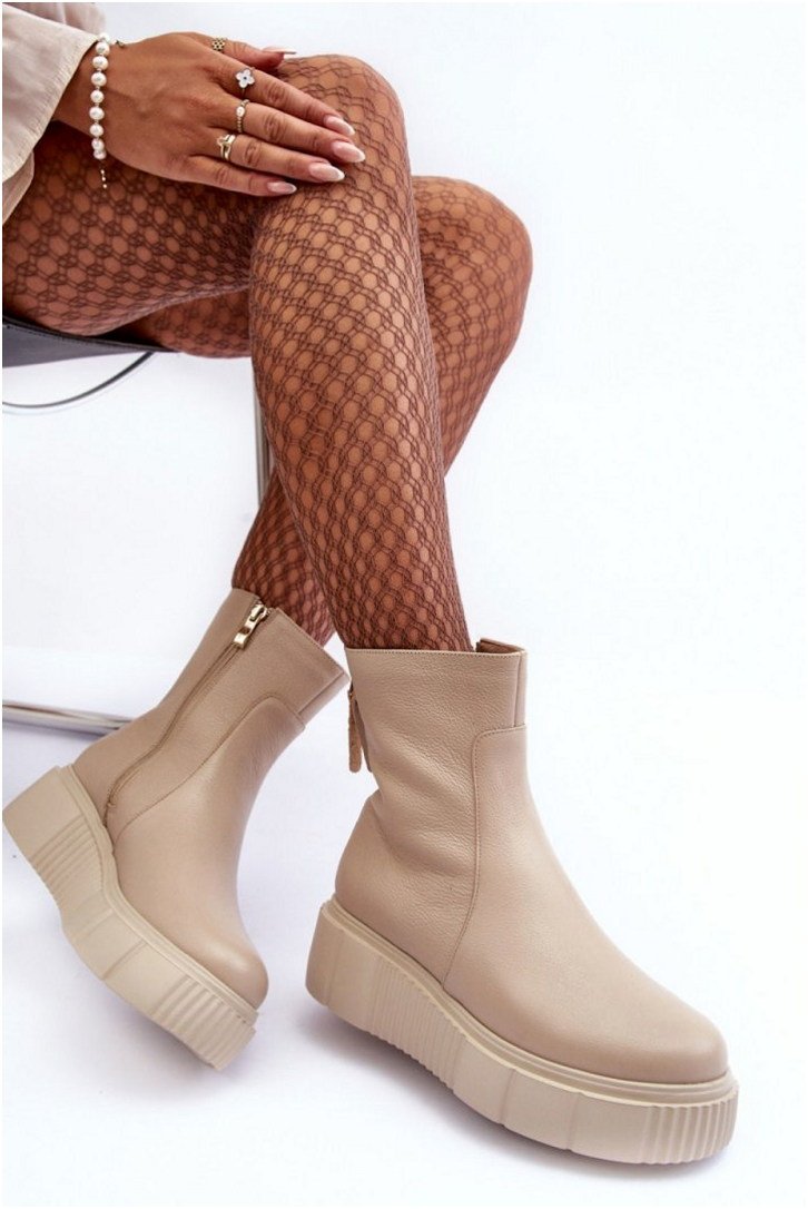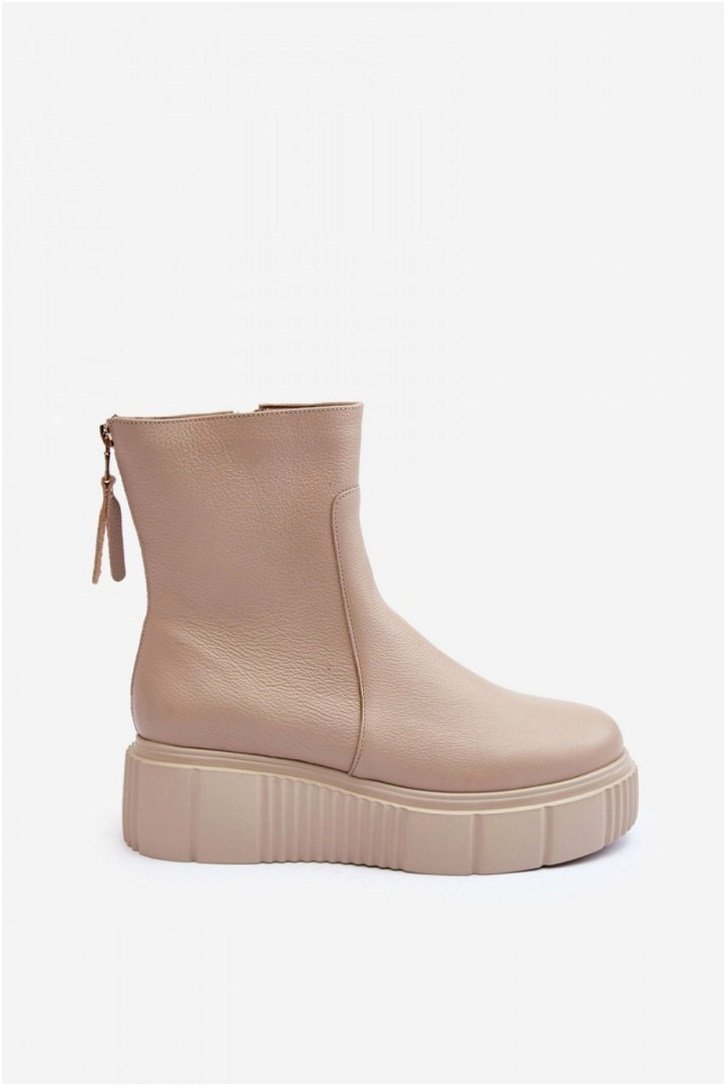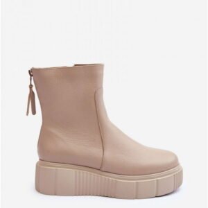 Ladies’ beige ankle boots crafted from high-quality natural leather. Featured with a robust platform and subtle wedge, with a decorative back zipper. Provides comfort with shoe blanket lining. Reinforced heel for stability. The shaft height is 17 cm, with a 5.5 cm heel, making them a perfect addition to autumn outfits.