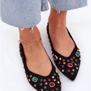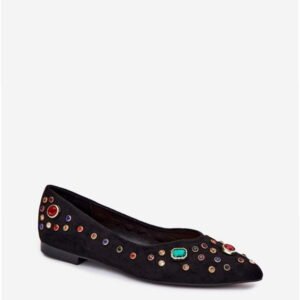 Model Valena JH525P to baleriny damskie o klasycznej konstrukcji płaskiej z noskiem w szpic. Cholewka wykonana jest z eko zamszu o matowej fakturze, zdobiona drobnymi kryształkami rozmieszczonymi równomiernie na przedniej części. Wnętrze buta wyposażono we wkładkę ze skóry ekologicznej, która zwiększa wygodę użytkowania. Konstrukcja oparta jest na elastycznej podeszwie syntetycznej, zapewniającej stabilny kontakt z podłożem. Niski obcas o wysokości 1 cm pozwala na codzienne użytkowanie w warunkach miejskich. Model dostępny w kolorze Black charakteryzuje się minimalistycznym profilem i kobiecą sylwetką. Zapięcie wsuwane umożliwia szybkie zakładanie i zdejmowanie. Buty przeznaczone są do zastosowań formalnych i casualowych.
