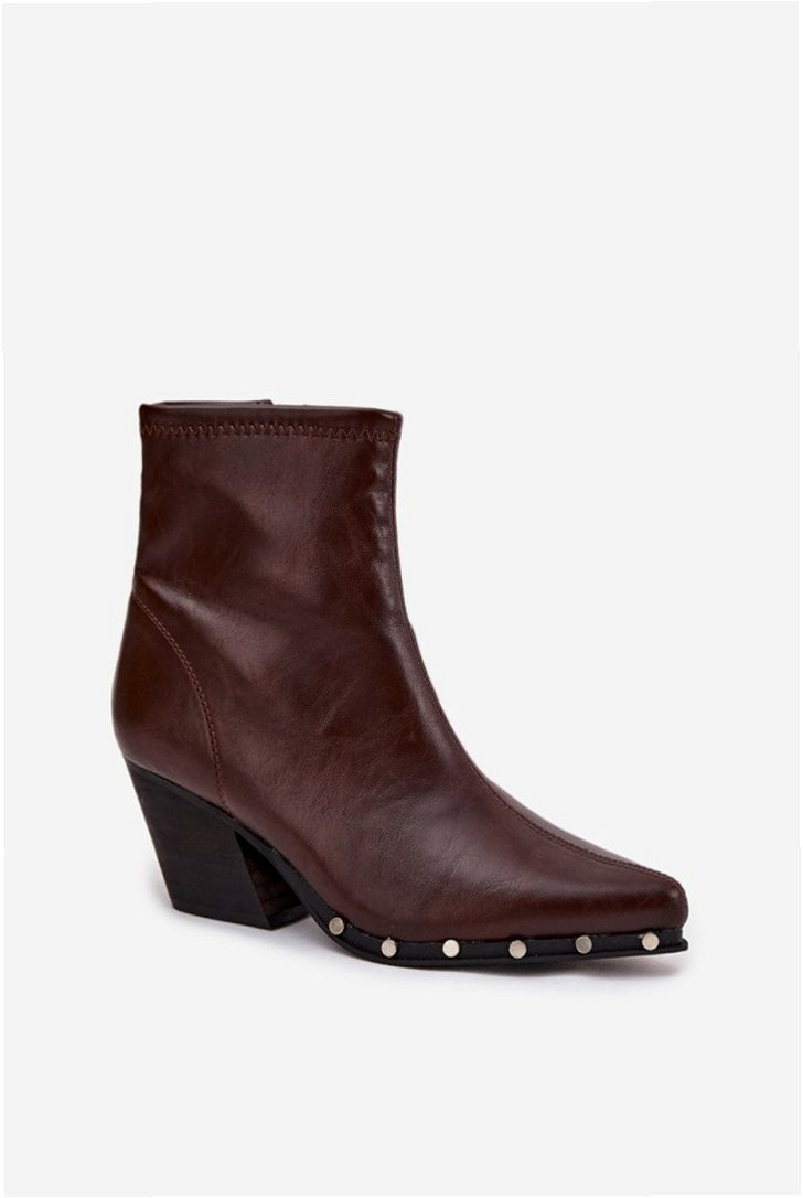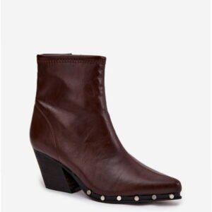 Model Abrielle C-857 to botki damskie o konstrukcji inspirowanej stylem western z cholewką wykonaną z eko skóry. Kolorystyka Brown i dekoracyjne elementy przy podeszwie podkreślają charakter modelu. Szpiczasty nosek i ścięty obcas typu słupek tworzą klasyczną sylwetkę obuwia. Cholewka o wysokości 14,5 cm oraz zamykane na suwak boczne zapięcie zapewniają wygodę użytkowania. Wnętrze z tkaninową wkładką poprawia komfort w codziennym noszeniu. Obcas o wysokości 7 cm zapewnia stabilne podparcie na płaskich powierzchniach. Gumowa podeszwa zapewnia przyczepność, a konstrukcja o profilu mid-cut wspiera kostkę. Elementy ozdobne w postaci ćwieków nadają całości charakteru użytkowego o tonalnym wykończeniu w brązie.