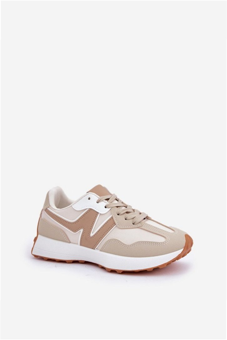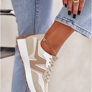 Model Britma LA295P to damskie buty sportowe o niskiej cholewce wykonanej z połączenia skóry ekologicznej i tkaniny w kolorze beżowym. Konstrukcja łączy syntetyczne panele z tekstylnymi wstawkami, co zapewnia przewiewność oraz trwałość materiału. Wewnętrzna wkładka z pianki dopasowuje się do kształtu stopy, ułatwiając utrzymanie czystości i zwiększając komfort użytkowania. Podeszwa środkowa o grubości 2,5 cm wykonana jest z materiału syntetycznego o średniej gęstości, zapewniającego stabilność i amortyzację. Zewnętrzna podeszwa z bieżnikiem wyposażona została w drobne wypustki, które poprawiają przyczepność na gładkich powierzchniach. Zapięcie sznurowane umożliwia regulację dopasowania, a całkowita wysokość cholewki wynosi 6 cm, tworząc stabilną konstrukcję do chodzenia po mieście oraz codziennego użytku.