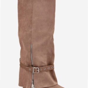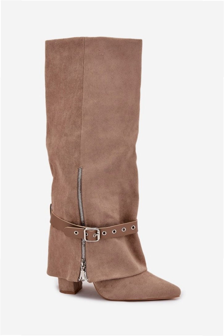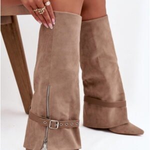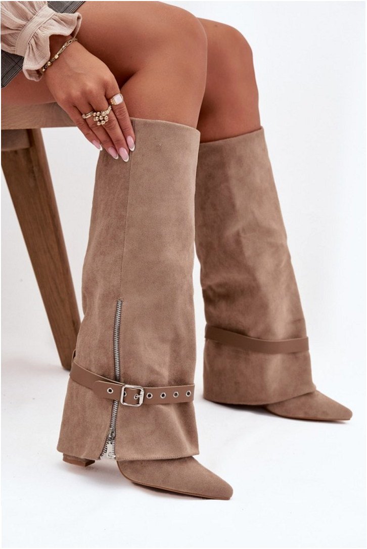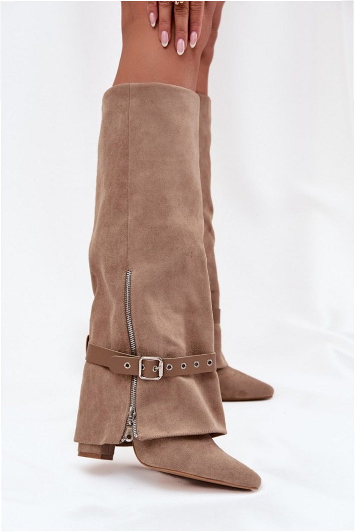 Model Jolivine 2502A-1 to damskie kozaki przed kolano wykonane ze skóry ekologicznej zamszowej w kolorze beżowym. Cholewka o wysokości 39,5 cm zachowuje smukły kształt, nachodząc subtelnie na obcas typu słupek o wysokości 10 cm. Konstrukcja wsuwana eliminuje potrzebę zapięć, a dodatkowy pasek z ozdobną klamrą umożliwia regulację dopasowania i kształtu w górnej części cholewki. Wnętrze wyłożone skórą ekologiczną poprawia komfort kontaktu ze stopą. Podeszwa wykonana z tworzywa syntetycznego zapewnia stabilność podczas chodzenia po twardych nawierzchniach. Nosek o szpiczastym profilu akcentuje klasyczną sylwetkę obuwia. Model przeznaczony do użytkowania miejskiego i codziennego w okresie jesienno-zimowym.