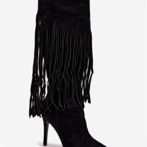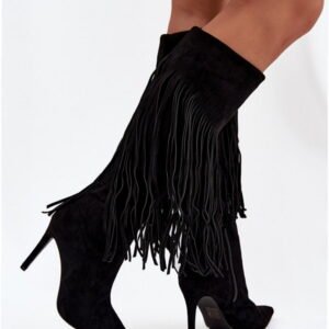 Model Isalune H-59 to damskie kozaki wykonane z miękkiej skóry ekologicznej o strukturze zamszu w kolorze czarnym. Cholewka o wysokości 38,5 cm obejmuje łydkę, tworząc smukły profil. Konstrukcja wsuwana uzupełniona jest o boczny suwak umieszczony w dolnej części dla ułatwienia zakładania. Wierzchnia warstwa materiału posiada liczne frędzle rozmieszczone równomiernie wzdłuż cholewki, co nadaje całości charakterystyczny wygląd o stylistyce boho.