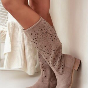 Cholewka z eko zamszu o ażurowym wzorze sięga przed kolano. Obcas 4,5 cm zapewnia stabilność, a zapięcie na zamek ułatwia zakładanie. Przeznaczenie: styl miejski.