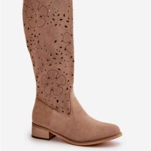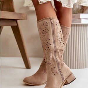 Model Orchides NS525P to kozaki damskie z wysoką cholewką wykonaną z eko zamszu w odcieniu Dark Beige. Cholewka sięga przed kolano, ma wysokość 36 cm i została wykończona ażurowym wzorem nadającym lekkość konstrukcji. Wewnętrzna część wykonana jest z ekologicznej skóry, co poprawia komfort noszenia. Konstrukcja opiera się na niskim obcasie o wysokości 4.5 cm, który zapewnia stabilność przy codziennym użytkowaniu. Noski są zaokrąglone, a usztywniony zapiętek zwiększa podparcie dla pięty. Kozaki wyposażone są w zamek boczny ułatwiający zakładanie. Warstwa zewnętrzna jest utrzymana w beżowej tonacji, co podkreśla klasyczny charakter modelu. Zastosowane materiały syntetyczne ograniczają absorpcję wilgoci i zwiększają trwałość struktury powierzchniowej. Model przeznaczony do użytku w sezonie przejściowym, o konstrukcji dostosowanej do codziennych warunków miejskich.