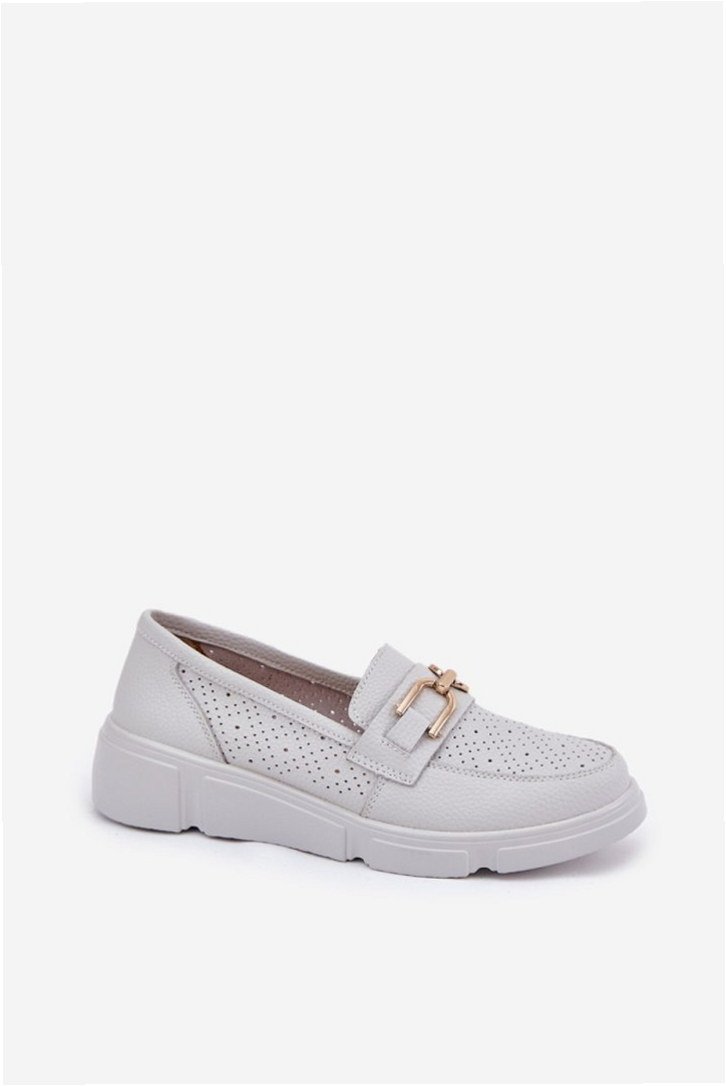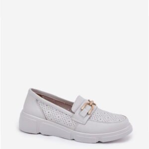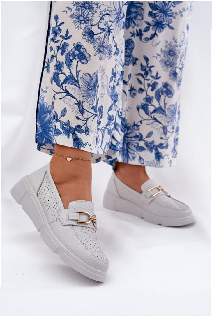 Model Vinceza 88007 to mokasyny damskie wykonane z naturalnej skóry w jasnoszarej kolorystyce. Konstrukcja opiera się na delikatnym koturnie o wysokości 4,5 cm, co zapewnia stabilne oparcie przy zachowaniu eleganckiego profilu. Cholewka posiada zaokrąglony nosek i subtelną metalową ozdobę w przedniej części. Wewnątrz znajduje się skórzana wkładka o właściwościach amortyzujących, wspierająca komfort użytkowania przez cały dzień. Cholewka o wysokości 6 cm dopasowuje się do kształtu stopy, zapewniając wygodne dopasowanie. Podeszwa wykonana jest z lekkiego tworzywa o dobrej elastyczności i przyczepności do gładkich powierzchni. Model posiada klasyczne wsuwane zapięcie, charakterystyczne dla mokasynów, eliminujące punkty nacisku. Przeznaczone do użytku codziennego w warunkach miejskich, łączą klasyczną estetykę z funkcjonalną konstrukcją.