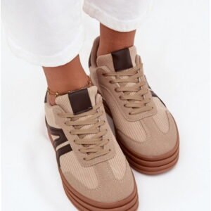 Model Corynelle 25817 to damskie sneakersy o konstrukcji low-top z połączenia tkaniny sztruksowej i zamszowej skóry ekologicznej w beżowej kolorystyce. Cholewka o wysokości 7,5 cm została wykonana z segmentów tekstylnych i syntetycznych połączonych metodą szycia klasycznego. Przednia część zastosowano z zaokrąglonym noskiem, a system sznurowania umożliwia równomierne dopasowanie. Podeszwa środkowa osadzona na platformie o wysokości 4 cm z elastycznego tworzywa gumowego zwiększa stabilność. Wkładka z pianki pokryta tkaniną tekstylną jest wyjmowana, co ułatwia utrzymanie higieny i zapewnia podstawową amortyzację. Podeszwa zewnętrzna wykonana z gumowego materiału o zwiększonej przyczepności posiada drobnożebrowany bieżnik dostosowany do miejskich nawierzchni. Całość uzupełnia niska konstrukcja z miękkim kołnierzem wyściełanym tkaniną. Model przeznaczony do codziennego użytkowania miejskiego.