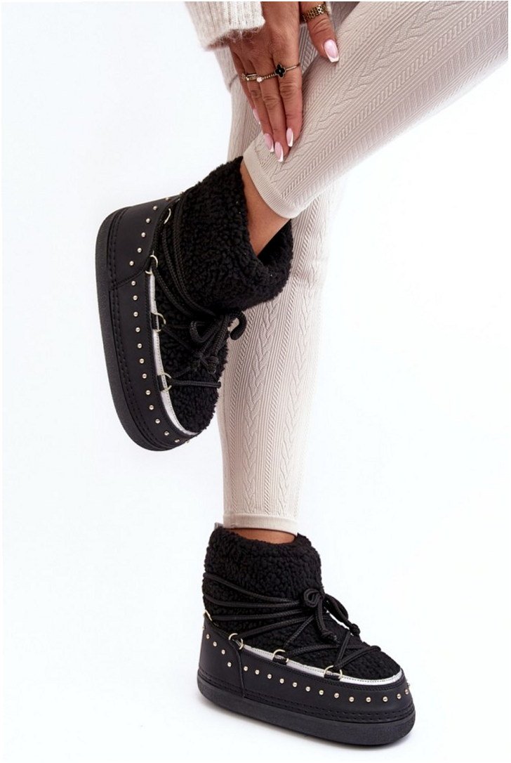 Model Rohes NB617 to damskie śniegowce o klasycznej konstrukcji wsuwanej, wykonane z połączenia tkaniny i skóry ekologicznej w kolorze czarnym. Cholewka o wysokości 15 cm jest wykończona sztucznym kożuszkiem i ozdobnymi ćwiekami, co zwiększa odporność na wiatr i niską temperaturę. Konstrukcja obejmuje solidną platformę o wysokości 3 cm, zapewniającą stabilność podczas chodzenia po śniegu. Wewnątrz zastosowano ocieplenie z pianki oraz koca obuwniczego, które odpowiada za utrzymanie ciepła i izolację termiczną. Zapięcie w postaci tradycyjnego sznurowania wspiera dopasowanie do stopy. Model przeznaczony do użytkowania w sezonie zimowym w warunkach miejskich.