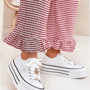 Model Fiorina 890-4B to damskie trampki z tekstylną cholewką osadzoną na masywnej platformie o wysokości 4.5 cm w kolorystyce White. Konstrukcja low-top łączy smukły profil z miejskim charakterem. Górna część wykonana z wytrzymałej tkaniny została wzmocniona w newralgicznych punktach, a system klasycznego sznurowania umożliwia regulację dopasowania. Dodatkowe elementy metalowe w złotym kolorze stanowią estetyczne wykończenie cholewki. Podeszwa środkowa z materiału o zwiększonej gęstości stabilizuje sylwetkę i amortyzuje kontakt z podłożem. Platforma o wysokości 4.5 cm zapewnia równomierne rozłożenie nacisku na całej powierzchni stopy, natomiast podeszwa zewnętrzna z tworzywa syntetycznego charakteryzuje się dobrą przyczepnością na gładkich nawierzchniach. Wkładka z ekoskóry poprawia komfort użytkowania, a 6.5-centymetrowa cholewka otacza stopę, zachowując elastyczność konstrukcji. Przeznaczone do codziennego użytkowania w przestrzeni miejskiej.
