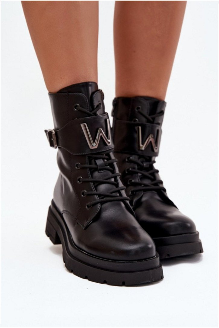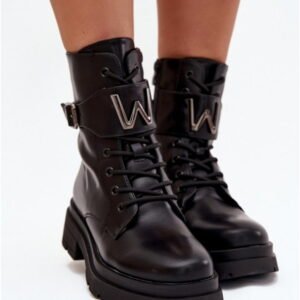 Model Ylianne QH7816 to damskie workery wykonane ze skóry ekologicznej o fakturze gładkiej w kolorze czarnym. Konstrukcja oparta na masywnej podeszwie platformowej z płaskim obcasem zapewnia stabilność podczas chodzenia. Wysokość cholewki wynosi 17,5 cm, co gwarantuje osłonę kostki i klasyczny profil sylwetki. Cholewka została wykonana z eko skóry o zwiększonej odporności na zarysowania, z ozdobnym paskiem z klamrą i metalową literą W. Zapięcie na zamek ułatwia zakładanie, a dodatkowe sznurowanie reguluje dopasowanie do podbicia. Platforma o wysokości 3 cm wykonana z tworzywa o dobrej elastyczności amortyzuje kontakt z podłożem. Wkładka tekstylna poprawia komfort noszenia w codziennym użytkowaniu. Konstrukcja jest zaklasyfikowana jako mid-cut, co zapewnia równowagę pomiędzy stabilizacją a mobilnością ruchu. Buty przeznaczone są do zastosowań casualowych i miejskich.