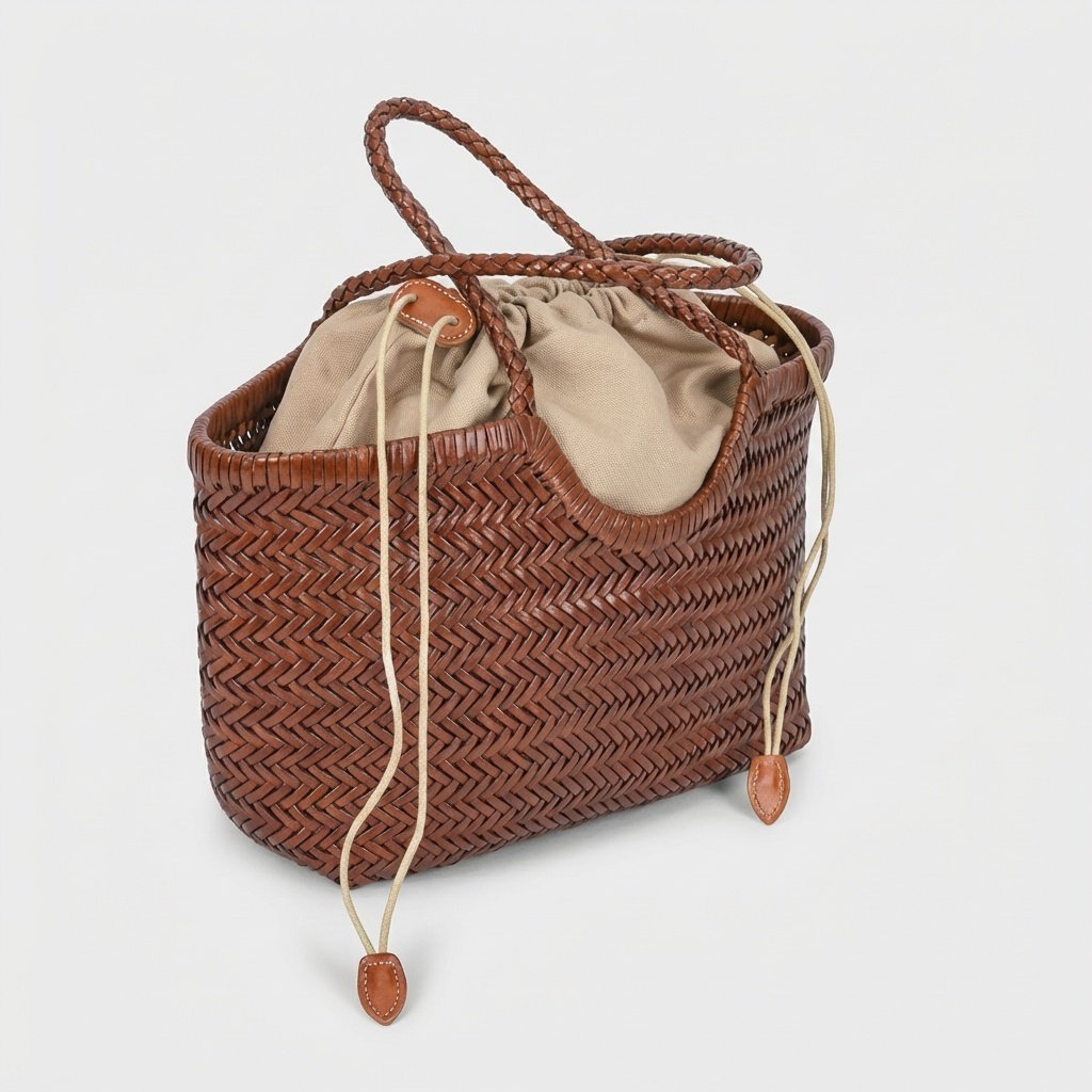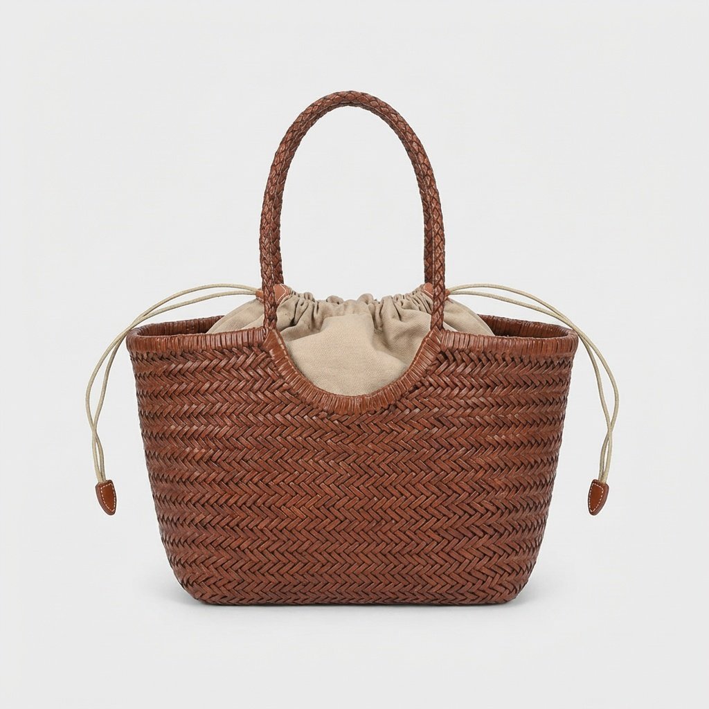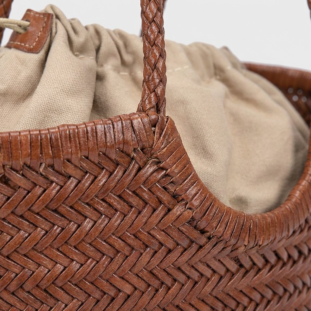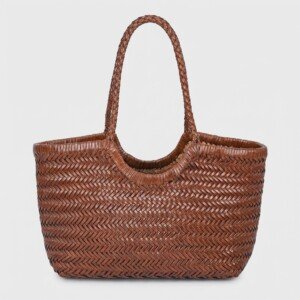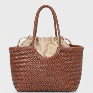 Shopper bag w odcieniu brązowym wykonana z naturalnej skóry bydlęcej w tradycyjnym splocie jodełkowym. Torebka charakteryzuje się ręcznym wykończeniem i skórzanymi detalami. Wewnętrzna część z poliestrowego materiału zamykana sznurkami tworzy funkcjonalny worek.