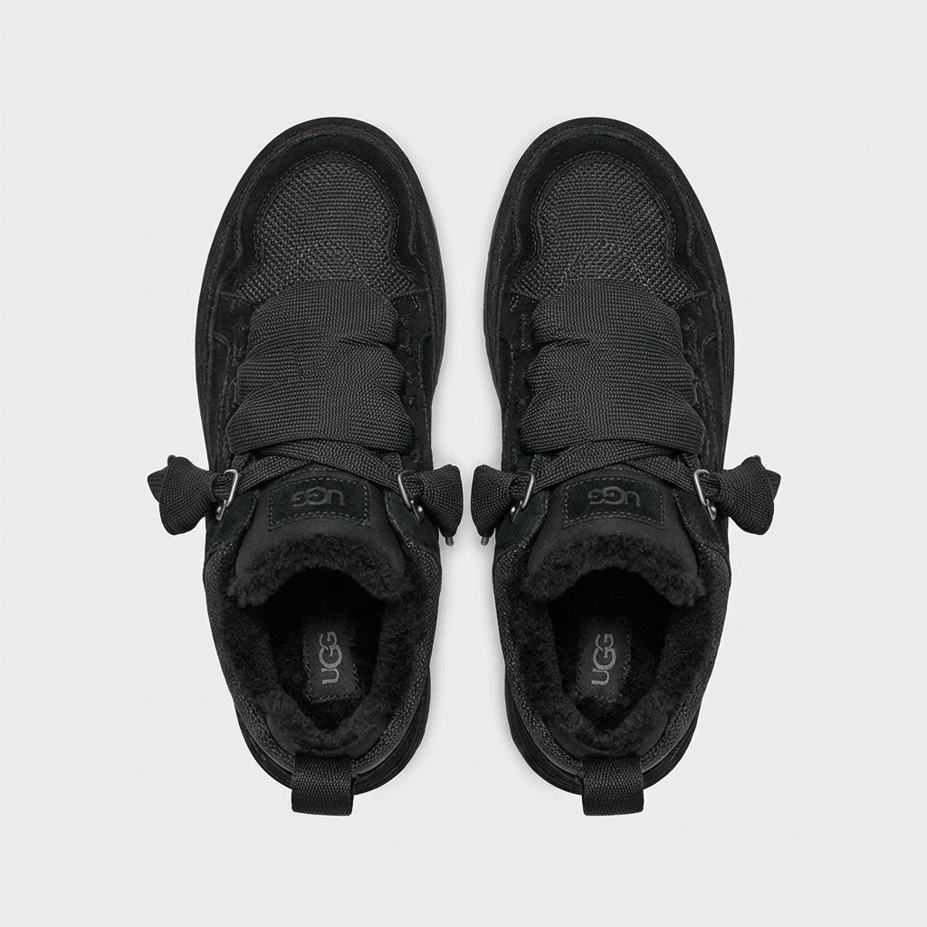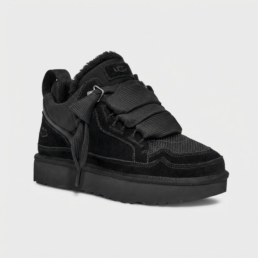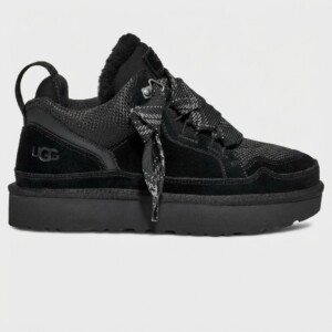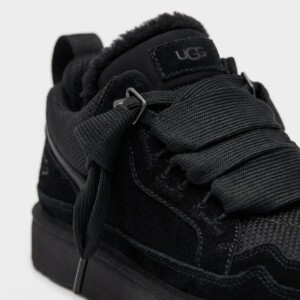 UGG Lowmel to ocieplone sneakersy łączące sportowy design z komfortem marki UGG. Model wykonany z zamszowej skóry i materiału tekstylnego w całkowicie czarnej kolorystyce. Masywna podeszwa z bieżnikiem zapewnia przyczepność i stabilność.