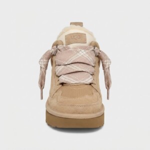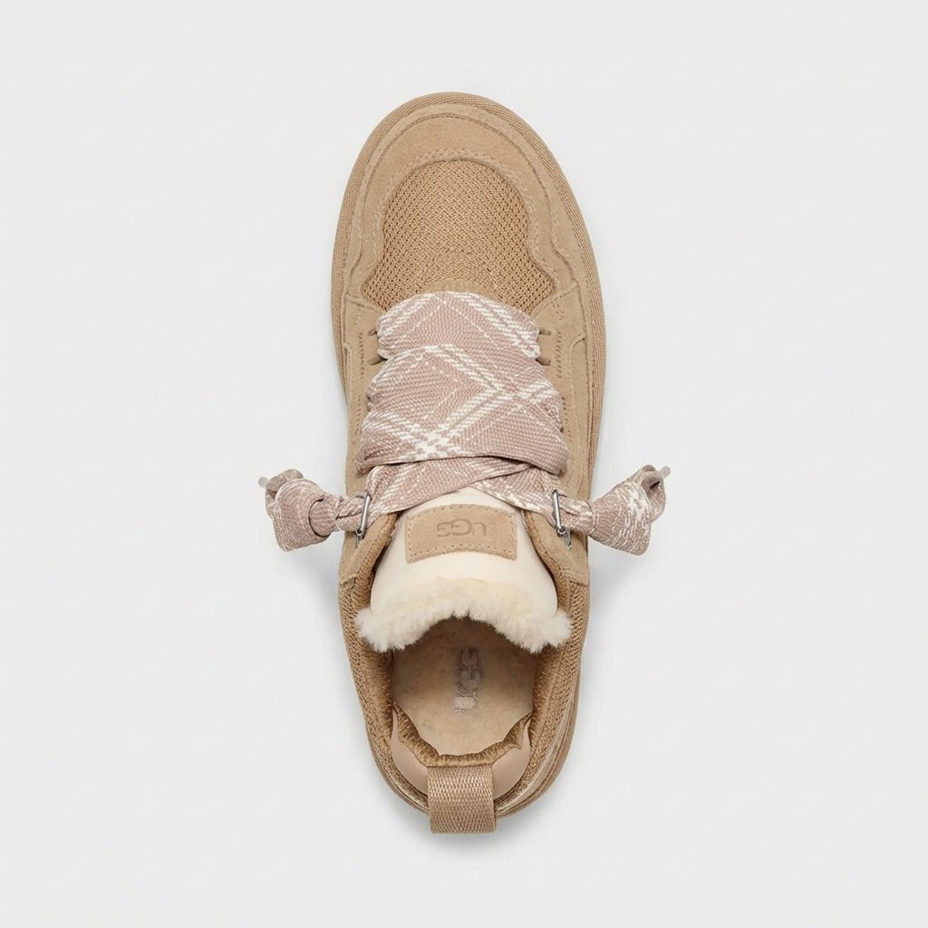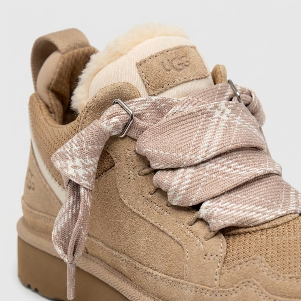 Sneakersy UGG Lowmel łączą komfort codziennego noszenia z charakterystycznym designem marki. Wykonane z wysokiej jakości zamszu w piaskowym kolorze, wyposażone są w ocieplającą podszewkę i platformową podeszwę. Ozdobne sznurówki z metalicznym połyskiem nadają modelowi subtelny akcent stylistyczny.