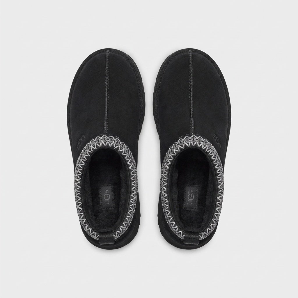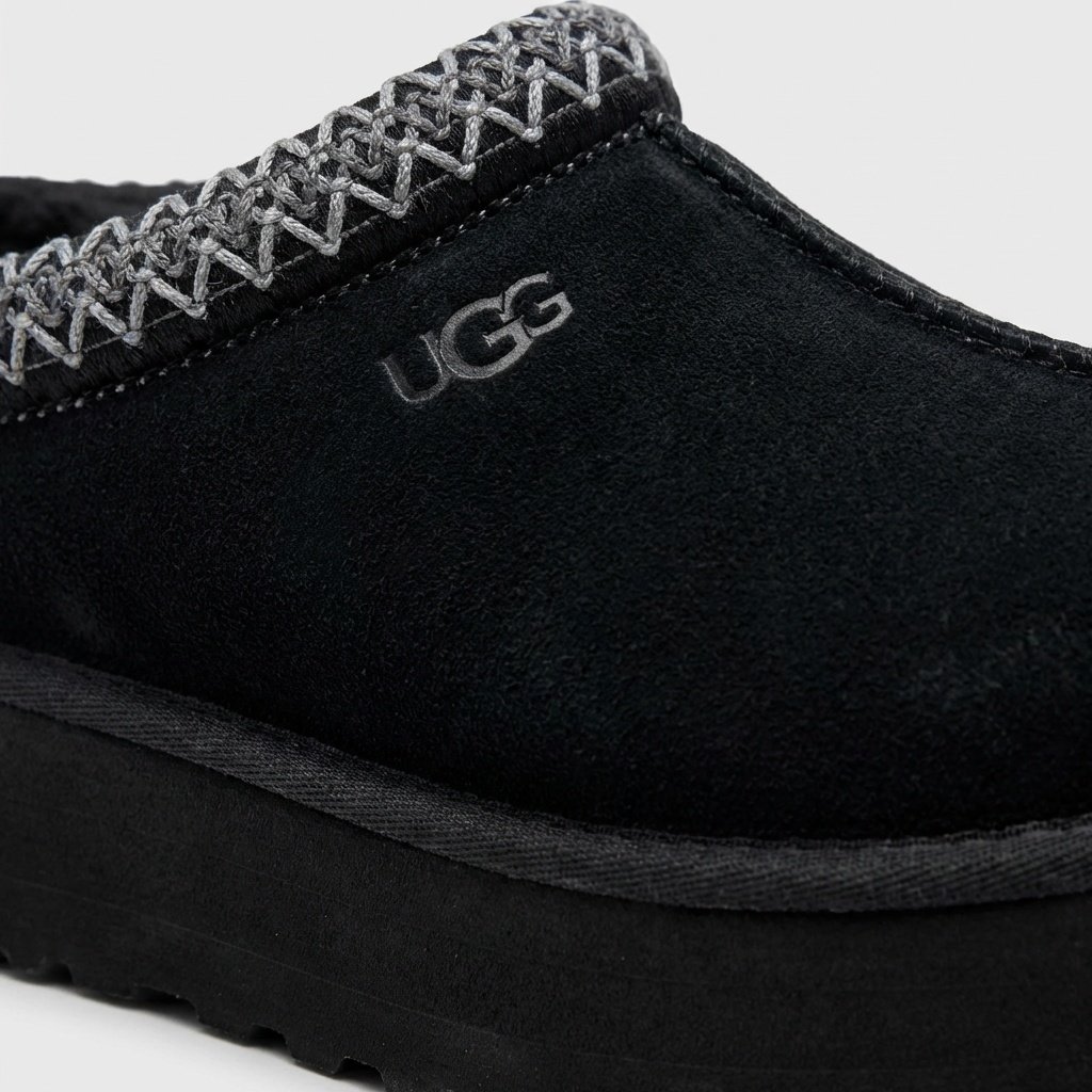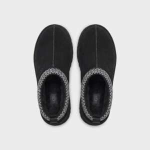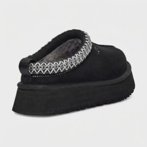 Kapcie UGG Tazz łączą komfort domowy z miejskim stylem dzięki charakterystycznej platformie o wysokości 4 cm. Wykonane z miękkiego zamszu w kolorze czarnym, wykończone naturalną wełną owczą zapewniającą termoregulację. Ozdobny wzór na cholewce nadaje modelowi charakterystyczny wygląd marki UGG.