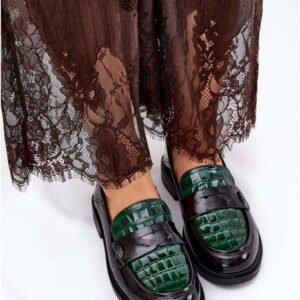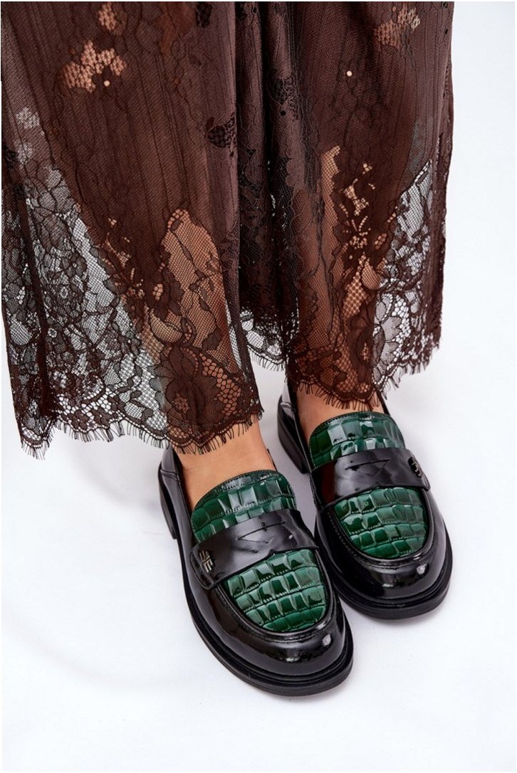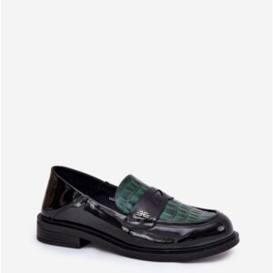 Model 91125 to damskie mokasyny o klasycznej konstrukcji z lakierowanej skóry naturalnej w kolorystyce Green/Black. Charakteryzują się niskim profilem i cholewką o wysokości 5,5 cm, zakończoną zaokrąglonym noskiem dla komfortu użytkowania. Wykonane metodą klejoną, posiadają precyzyjne przeszycia wzdłuż krawędzi oraz subtelne tłoczenie z przodu, które nadaje strukturę powierzchni. Wewnętrzna wkładka z naturalnej skóry wspiera amortyzację i utrzymuje trwałość formy podczas długotrwałego noszenia. Obcas o wysokości 3 cm wykonany został z trwałego tworzywa, zapewniając stabilność na gładkich powierzchniach. Podeszwa o drobnożłobionej fakturze gwarantuje przyczepność w codziennym użytkowaniu miejskim. Model posiada tradycyjny profil slip-on, ułatwiający zakładanie i dopasowanie do stopy. Mokasyny przeznaczone są do codziennego użytku w warunkach miejskich oraz do stylizacji biznesowo-casualowych.