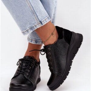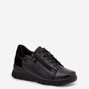 Model Vinceza 39964 to damskie półbuty o konstrukcji typu low-cut wykonane z naturalnej skóry w kolorze czarnym. Cholewka o wysokości 7.5 cm została uformowana z gładkiej skóry licowej z bocznym zamkiem błyskawicznym i klasycznym sznurowaniem dla stabilnego dopasowania. Wewnętrzna wkładka ze skóry naturalnej wspiera wentylację i utrzymanie kształtu wewnątrz obuwia. Koturna o wysokości 5.5 cm została zaprojektowana z myślą o równomiernym rozłożeniu obciążenia i zachowaniu stabilności przy chodzeniu po twardych nawierzchniach. Podeszwa z tworzywa gumowego charakteryzuje się elastycznością i dobrą przyczepnością. Konstrukcja low-cut ułatwia zakładanie i zdejmowanie obuwia oraz zapewnia komfort użytkowania w codziennych stylizacjach miejskich.