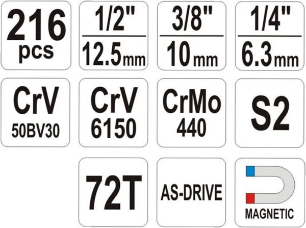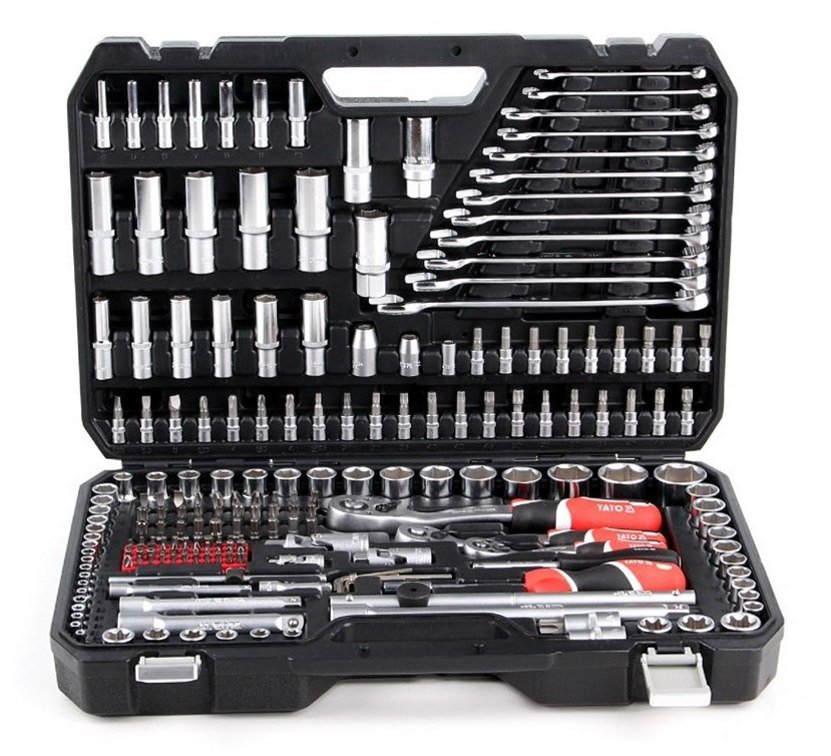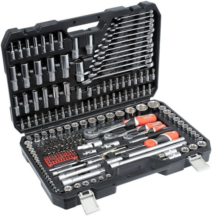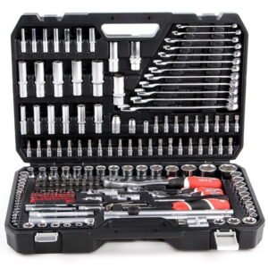 The YATO tool set YT-38841 boasts an impressive 216 pieces, which include holders in sizes 1/4″, 3/8″, and 1/2″. It features an array of combination wrenches, socket wrenches, and screwdriver handles, ensuring comprehensive functionality. The ergonomic grips are designed to provide exceptional comfort during prolonged use, while the quick-release mechanism allows for effortless tool changes. Furthermore, the set’s corrosion resistance significantly extends its lifespan, and its sleek black and chrome finish imparts a professional aesthetic, making it suitable for both professionals and DIY enthusiasts alike.